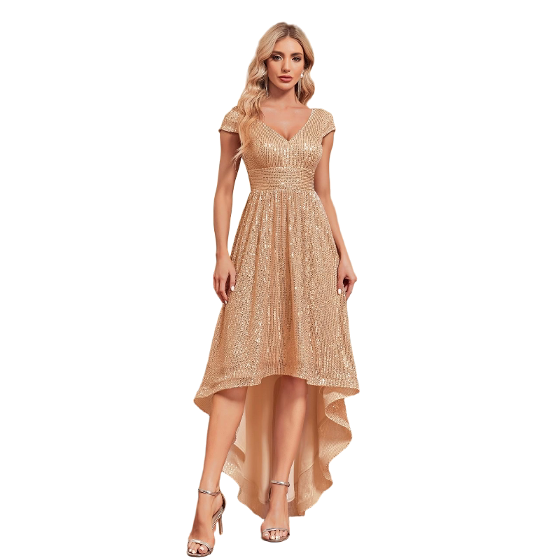 📚 亚马逊欧美新款亮片盖袖连衣裙v领长裙金色修身鱼尾宴会晚礼服女v