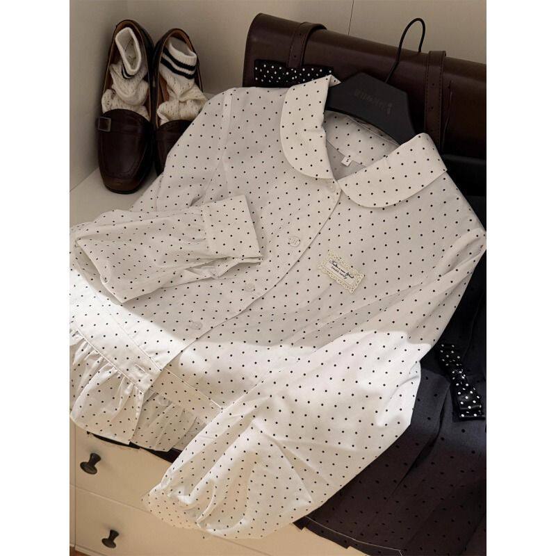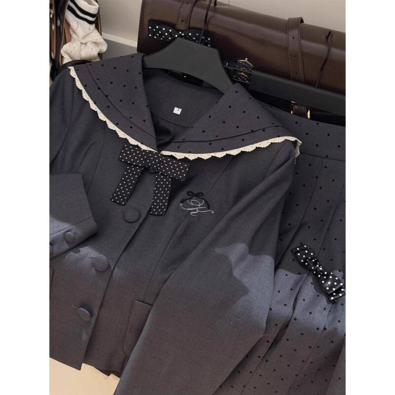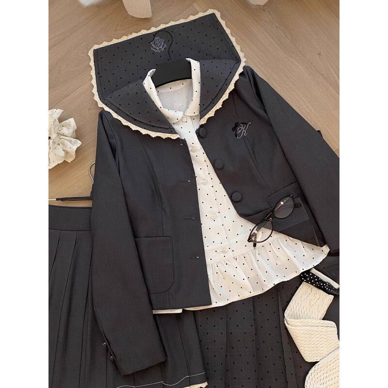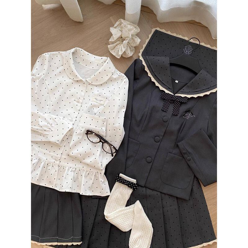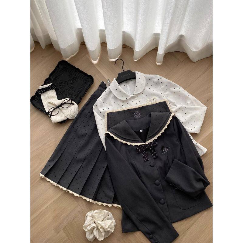📚 银砂糖原创设计水手领波点衬衫学院千金风蕾丝套装中长裙韩系套装