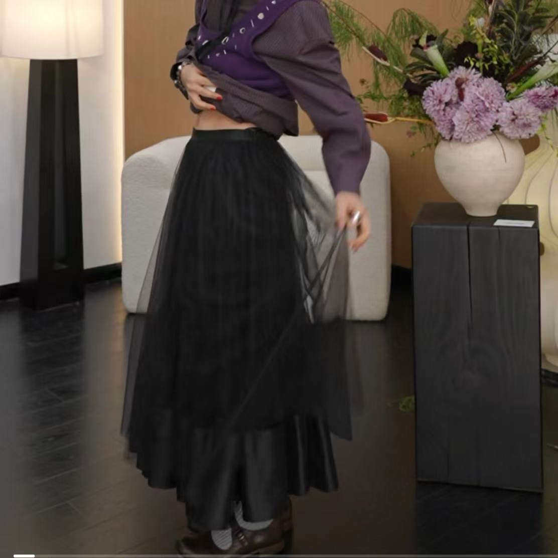 📚 周美美同款 暗纱织梦轻盈双层薄纱堆叠拼接黑色网纱半裙