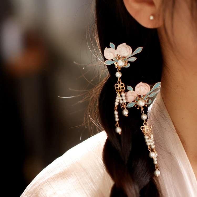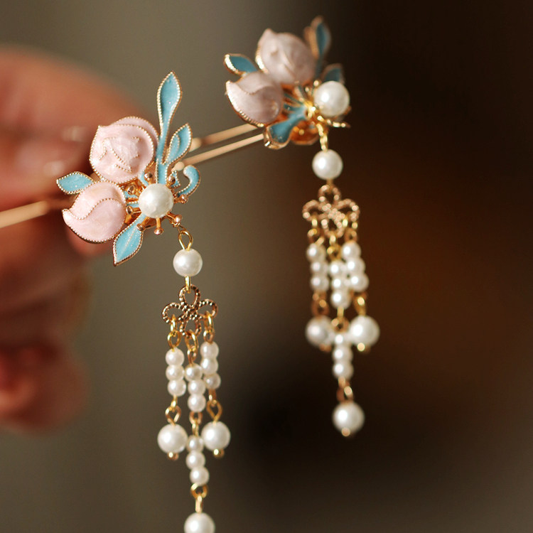 📚 流光星 粉蓝色仙气流苏发簪汉服头饰珍珠女汉服发饰步摇 花簪点缀