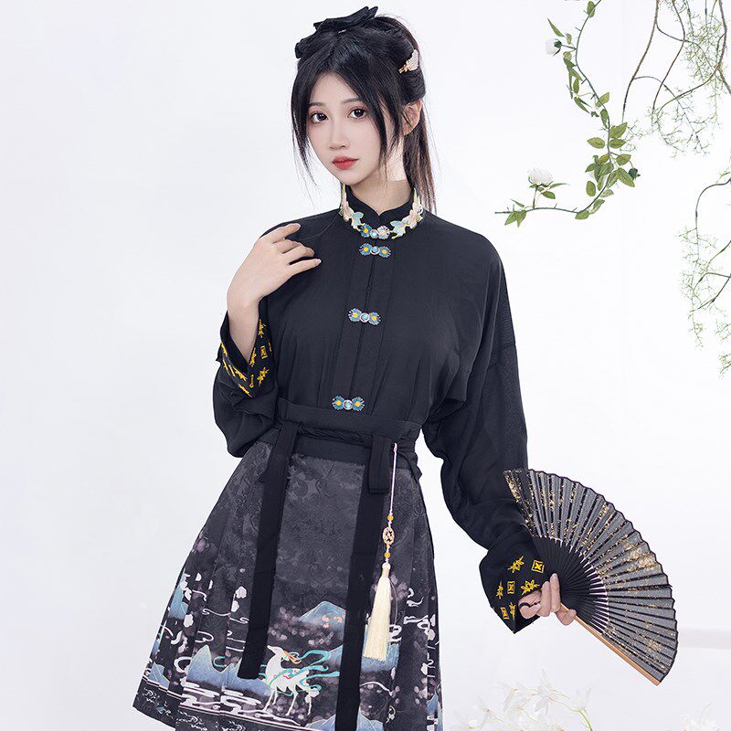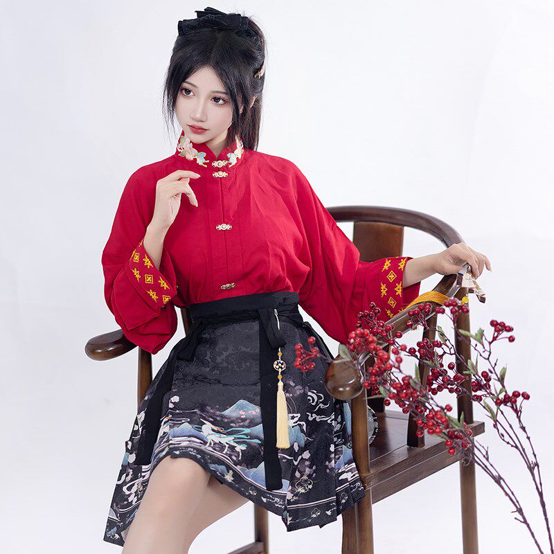 📚 王洪旗白鹿汉服女新中式短款马面短裙国风汉元素套装上衣新款红色