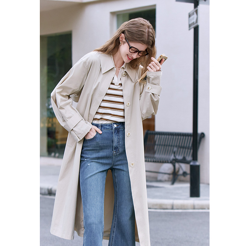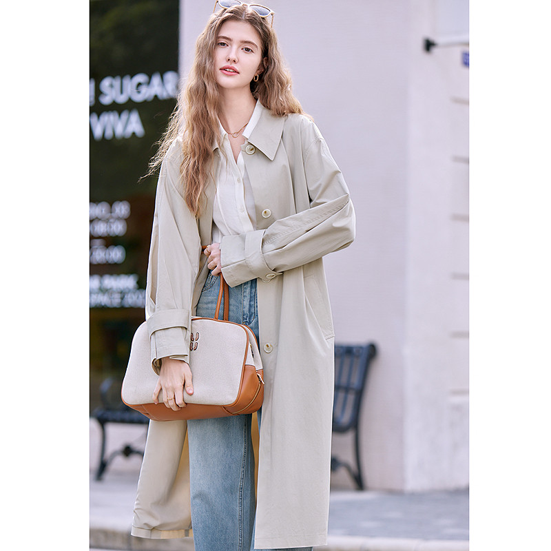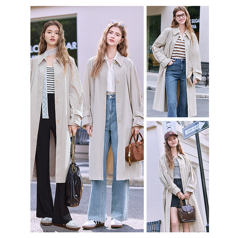 📚 betu百图杏色单排扣风衣外套女2026年春季新款宽松显瘦长款大衣