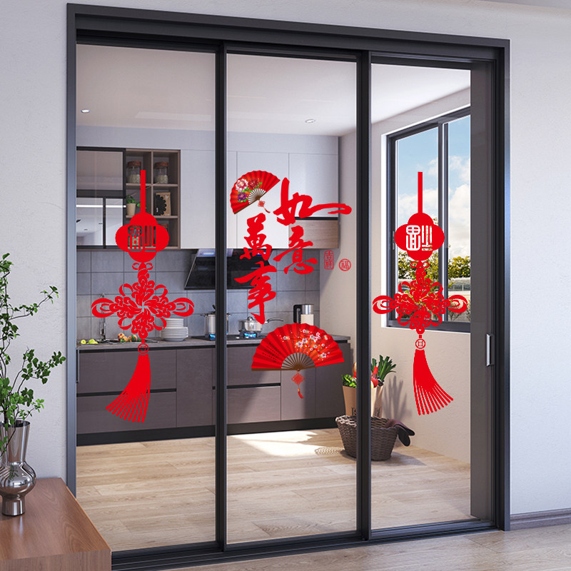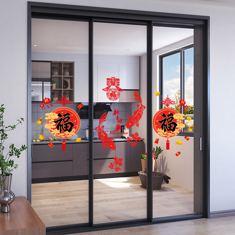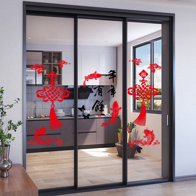 📚 厨房三门小推拉门装饰福袋贴纸防撞玻璃门贴画新年喜庆过年窗花贴
