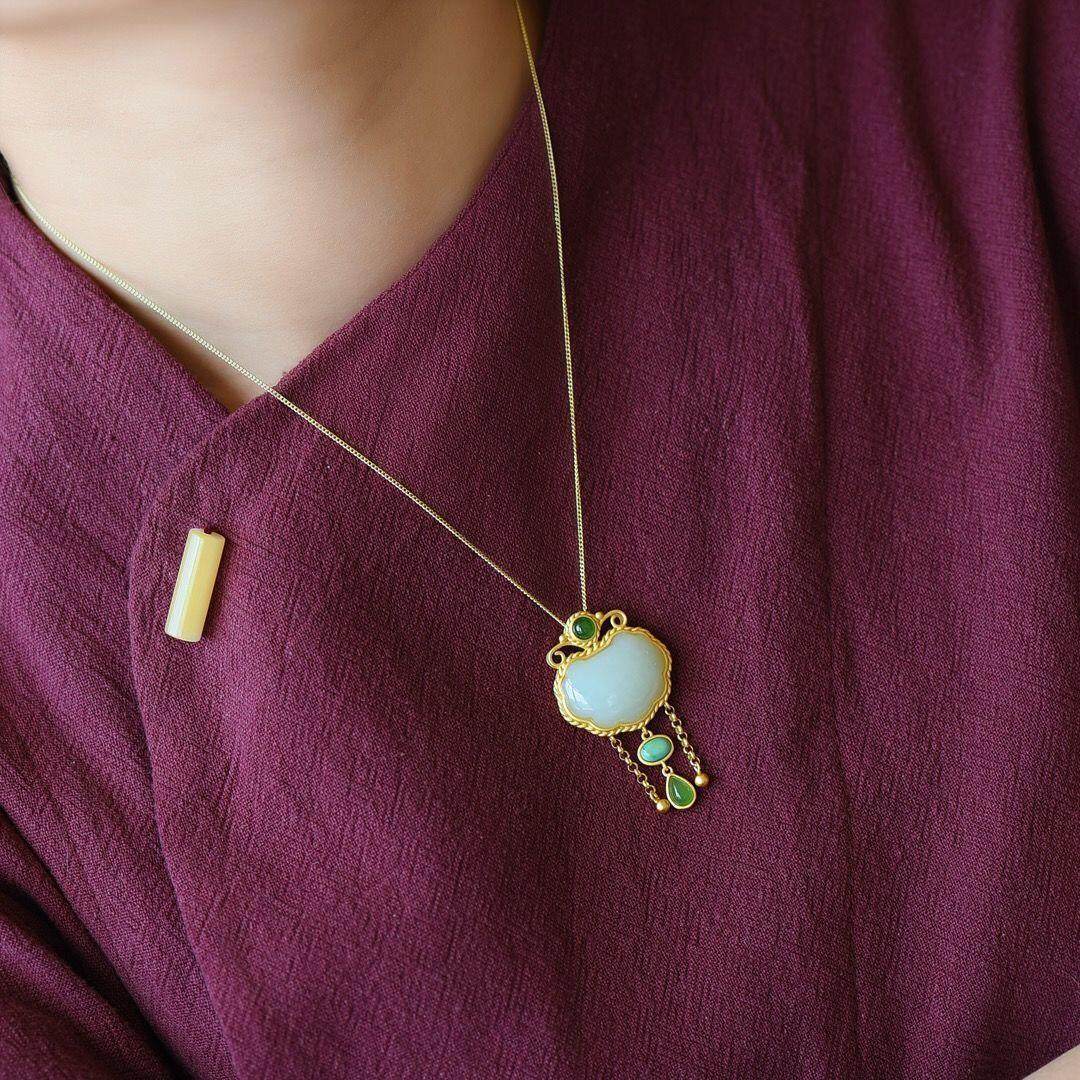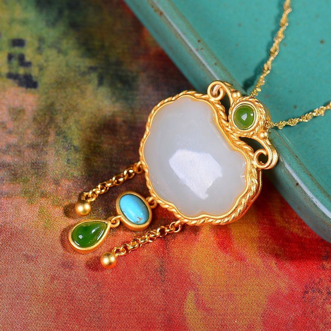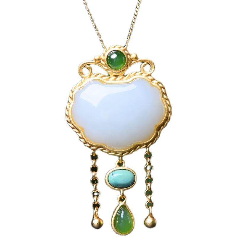 📚 古风长命锁吊坠女天然玉石平安锁和田玉项链金镶玉生日礼物女友