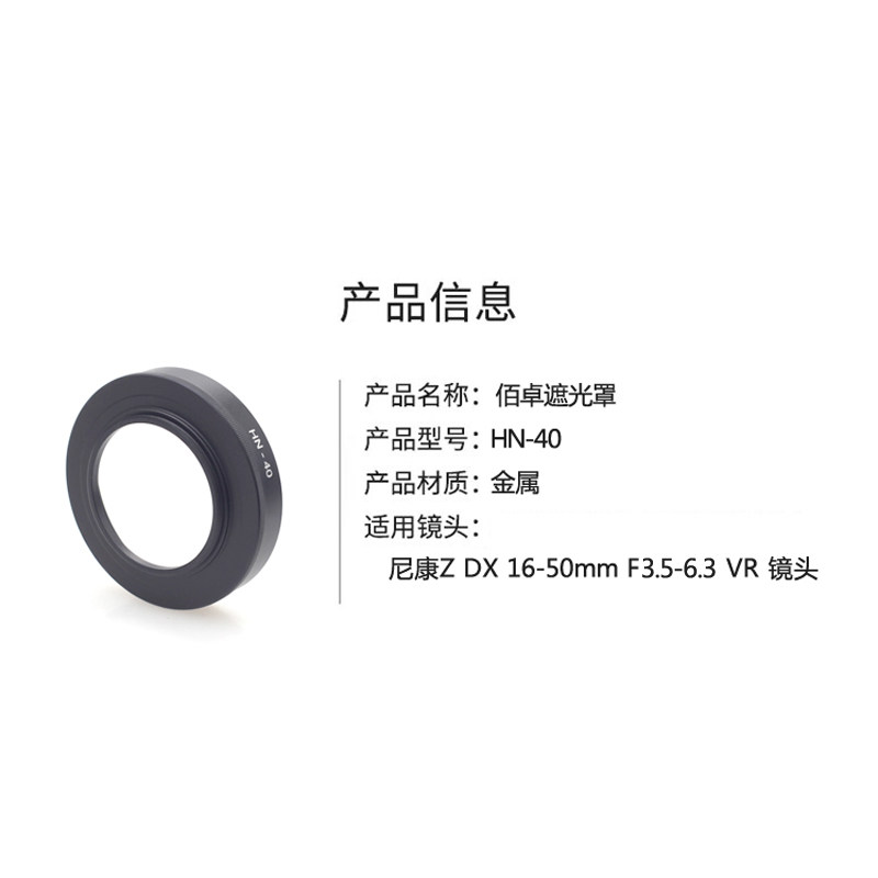 📚 佰卓替代尼康HN-40遮光罩 适用于Nikon微单相机Z50 Z30 Zfc镜头Z 16-50mm套机配件46mm 黑色 银色金属材质