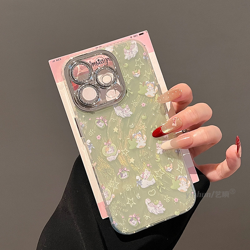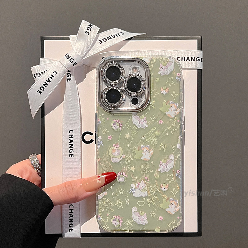 📚 适用苹果16promax手机壳2025新款iphone17pro超萌满屏青苹果小猫14plus日韩卡通13可爱女款15pm全包12保护套