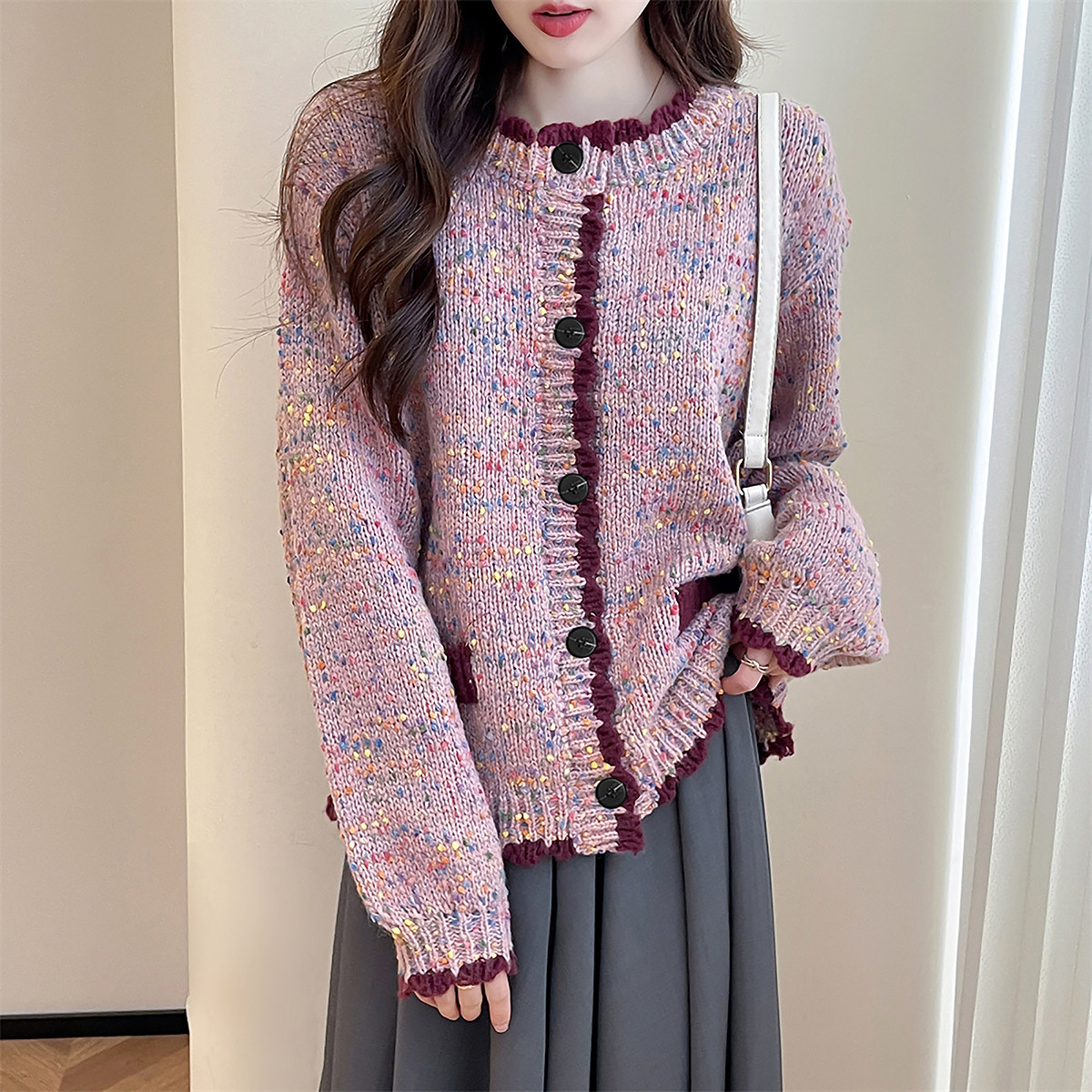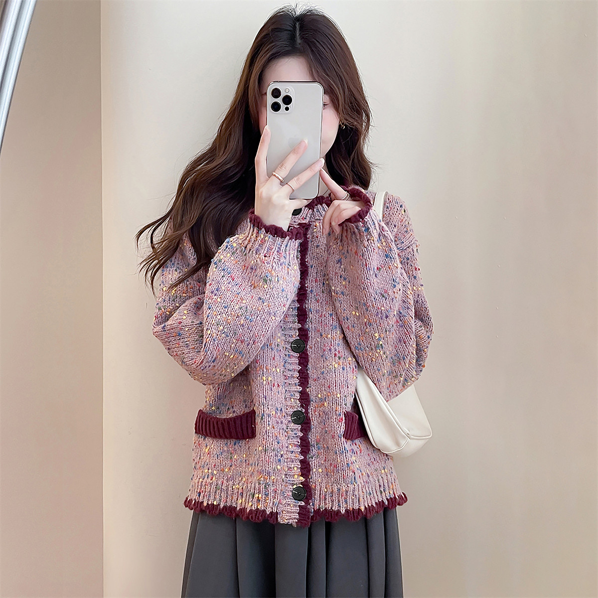 📚 唐狮秋冬季女毛衣小香风撞色设计花纱圆领开衫红色费尔岛外套TD
