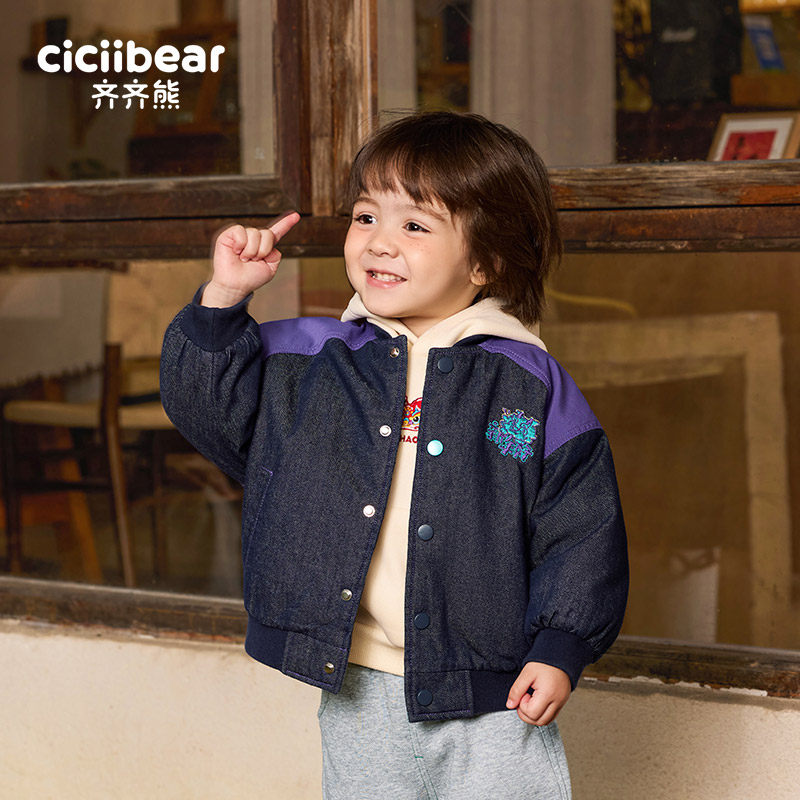 📚 【防褪色牛仔】齐齐熊宝宝夹棉牛仔棒球服外套男童秋冬款棉袄棉服