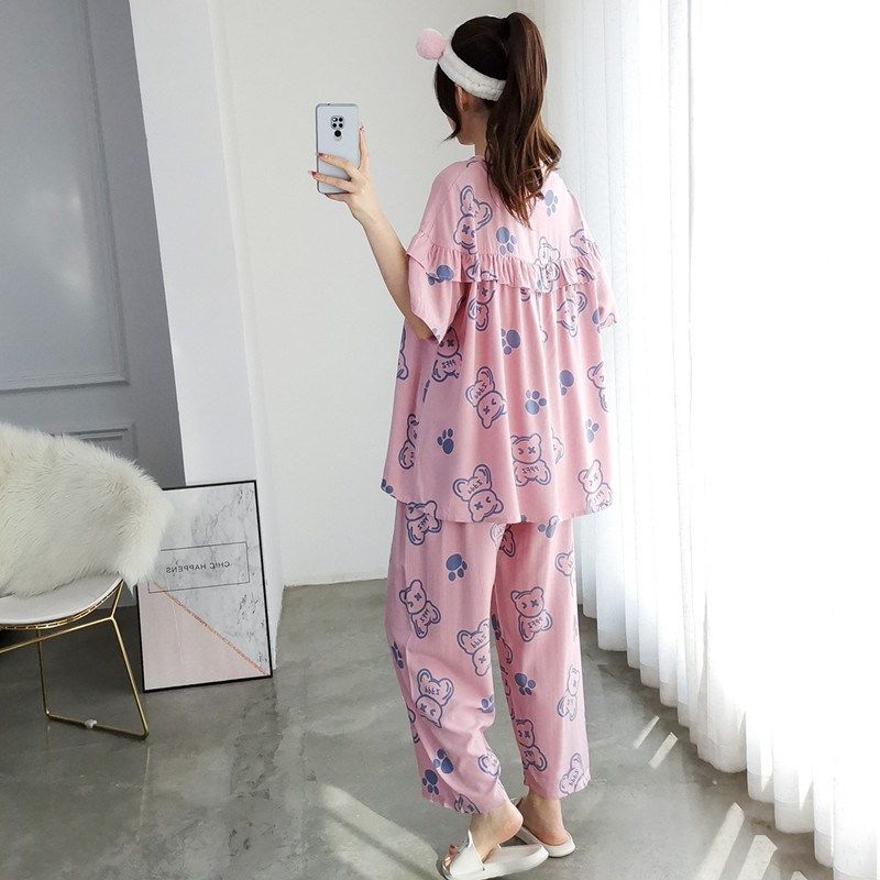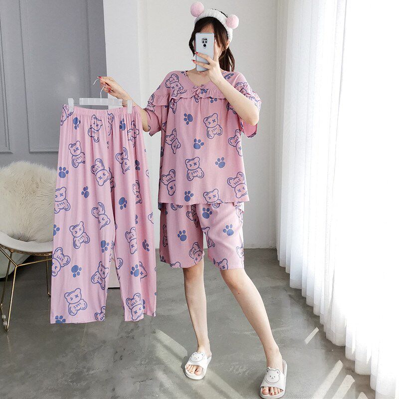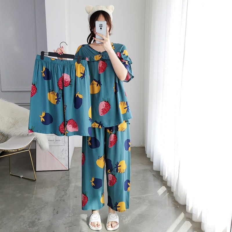 📚 三件套睡衣女加大码绵绸短袖短裤夏季胖MM200斤S宽松长裤家居服女