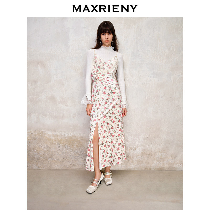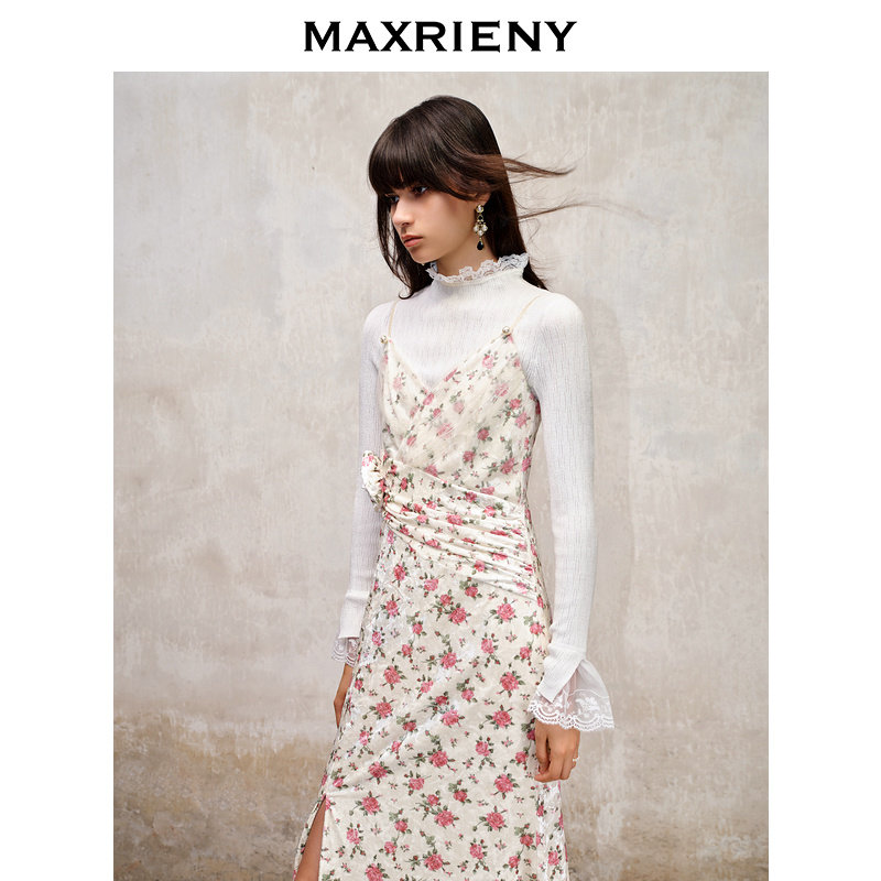 📚 【奥莱】MAXRIENY粉花宫廷复古风立体花丝绒提花连衣裙裙子