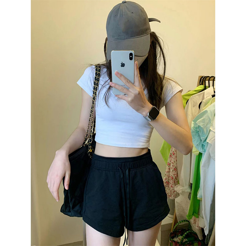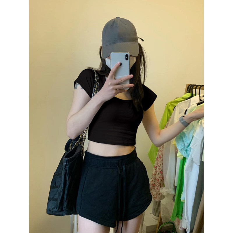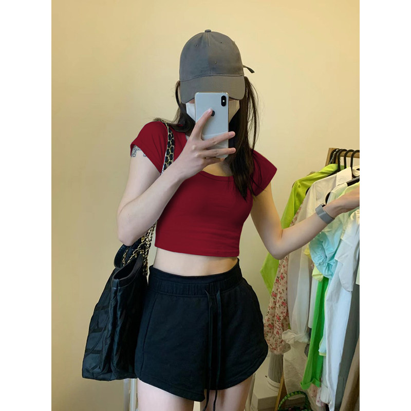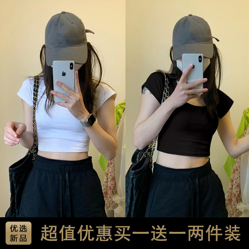📚 2025欧美热辣露脐短款小个子高腰绝美上衣女夏款正肩短袖t恤紧身