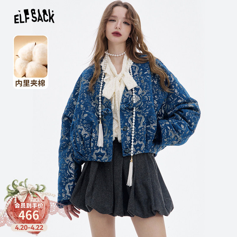 📚 妖精的口袋蓝底银纹新中式棉衣外套女2026冬新高级感千金风穿搭