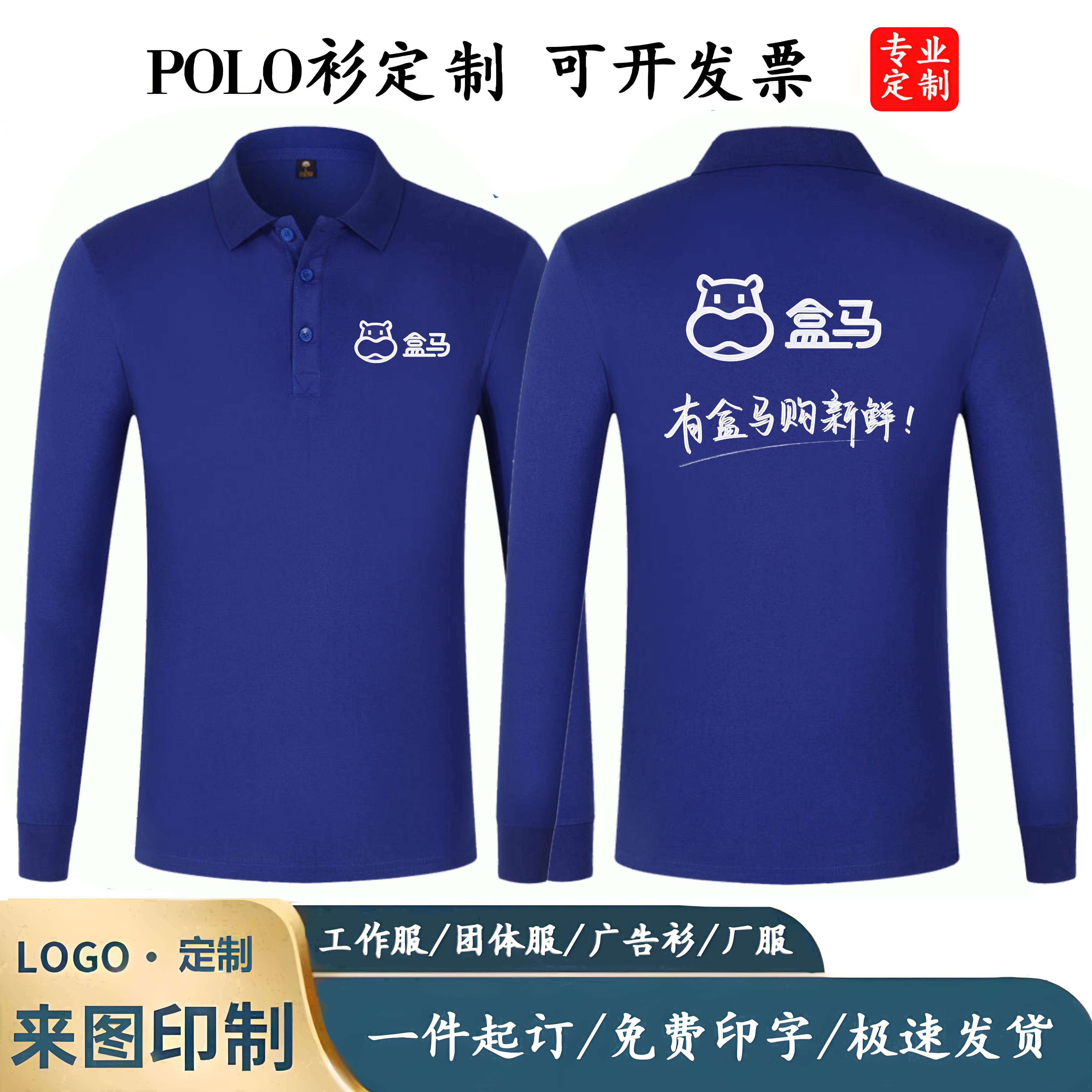 📚 盒马工作服定制印字logo春秋长袖POLO衫生鲜超市配送翻领T恤工装