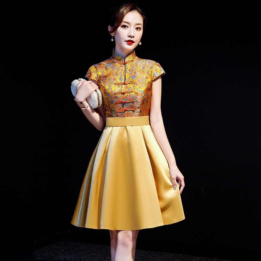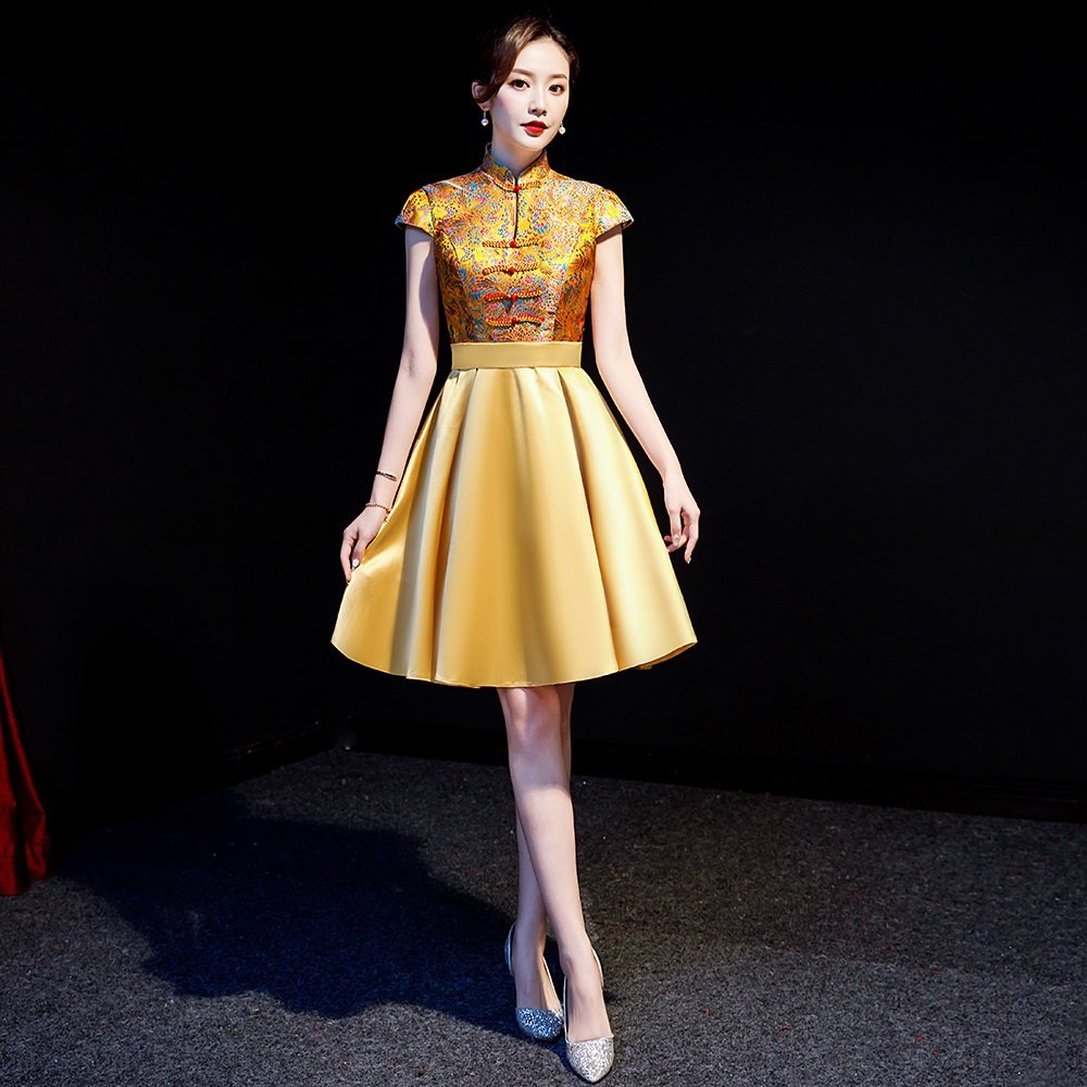 📚 紫缘萱小个子主持人朗诵改良旗袍短款黄色宴会晚礼服舞台演出服女