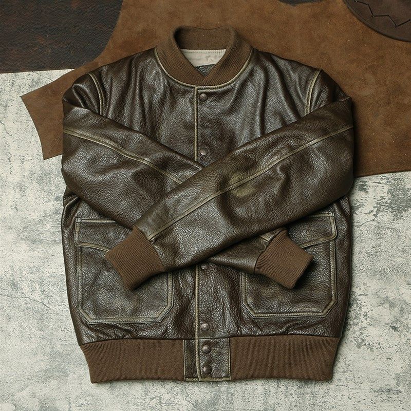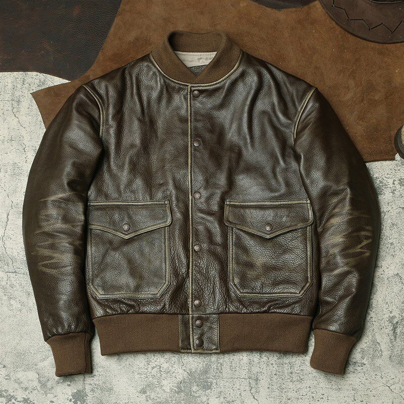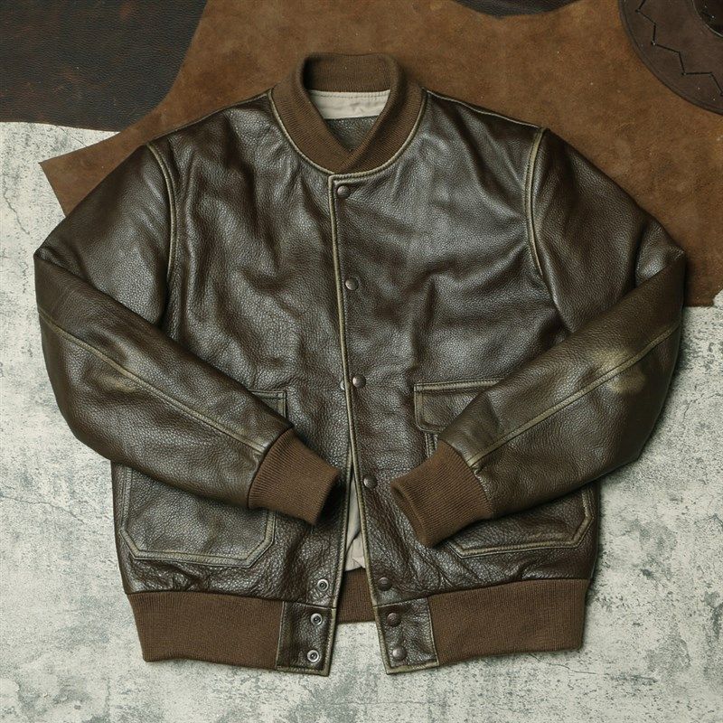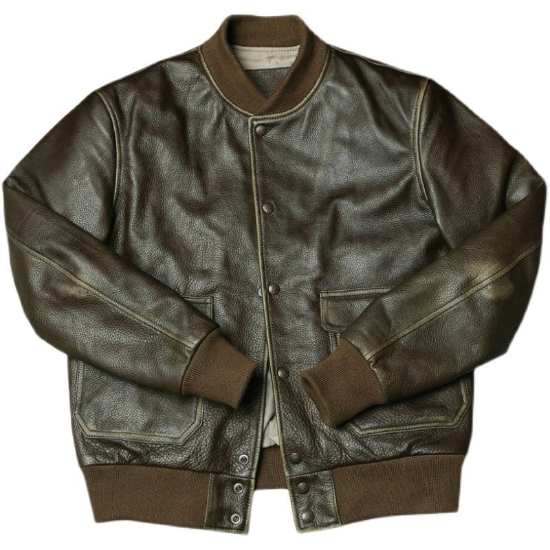 📚 A1橄榄绿飞行服皮衣 复古擦色做旧皮夹克 茶芯黄牛皮男士真皮外套