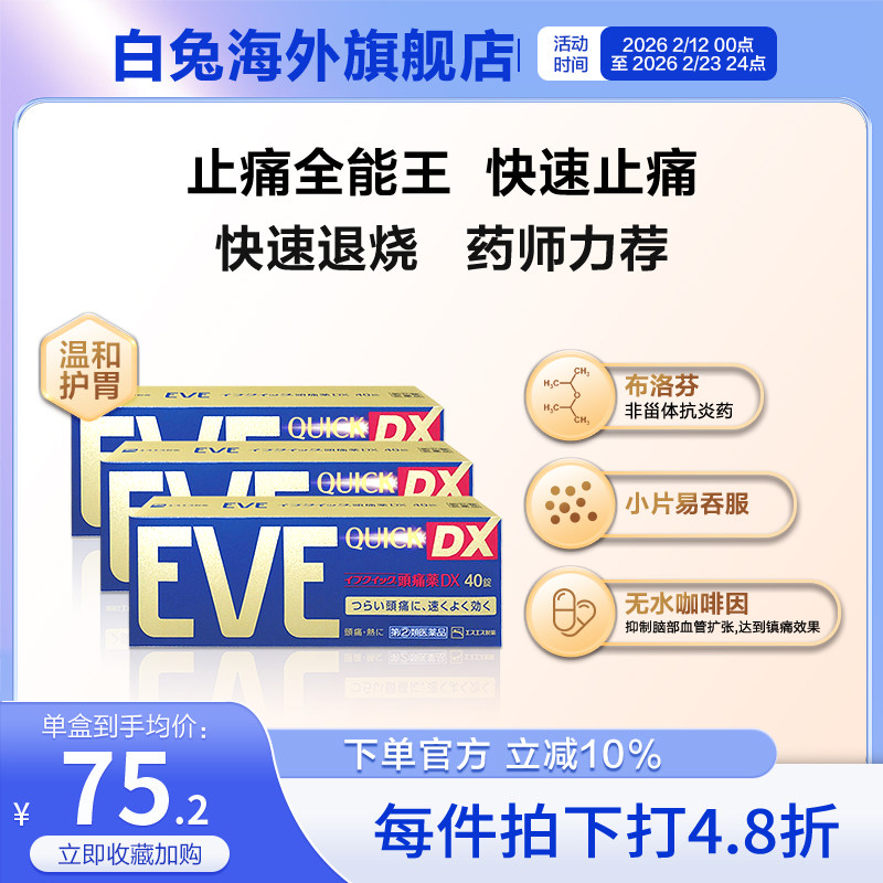 📚 eve白兔止疼药喉咙痛速效头疼药退烧药痛经牙疼药布洛芬40片*3盒