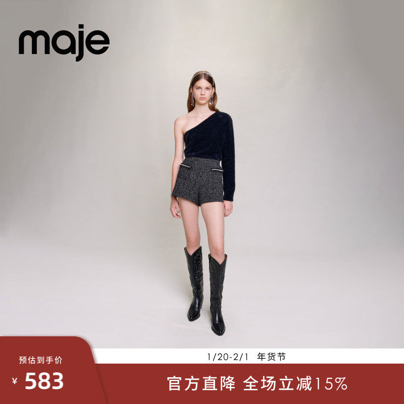 📚 Maje Outlets秋冬女装时尚粗花呢黑色亮片仿珍珠装饰高腰休闲短裤