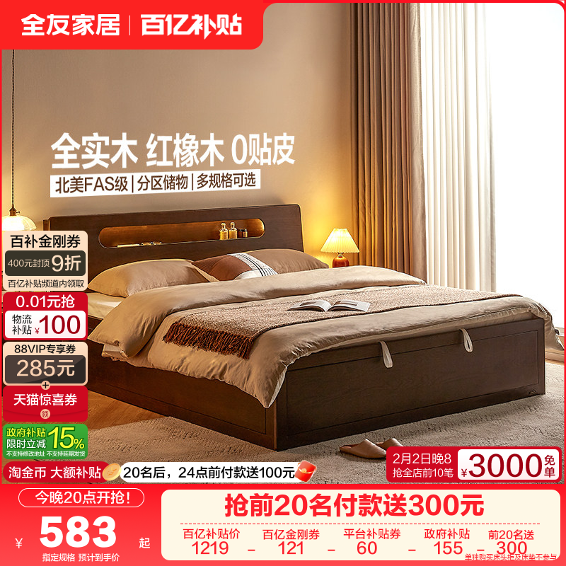 📚 政府补贴全友家居北欧风橡木实木床1米8双人床架主卧室储物床1米5