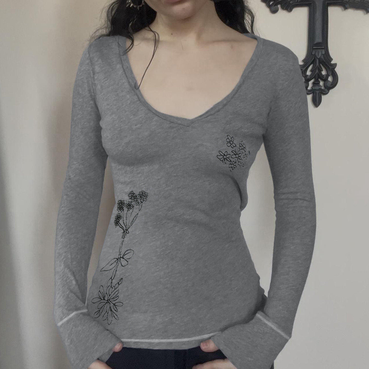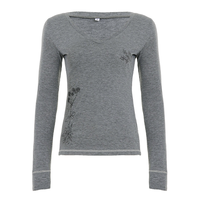 📚 ROCKMORE【古着味】灰色简易刺绣v领长袖T恤vintage复古修身上衣