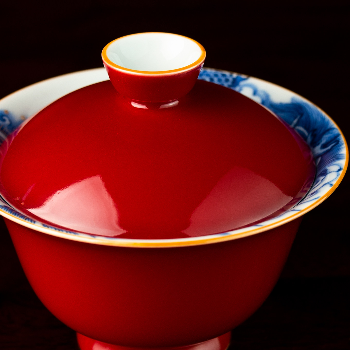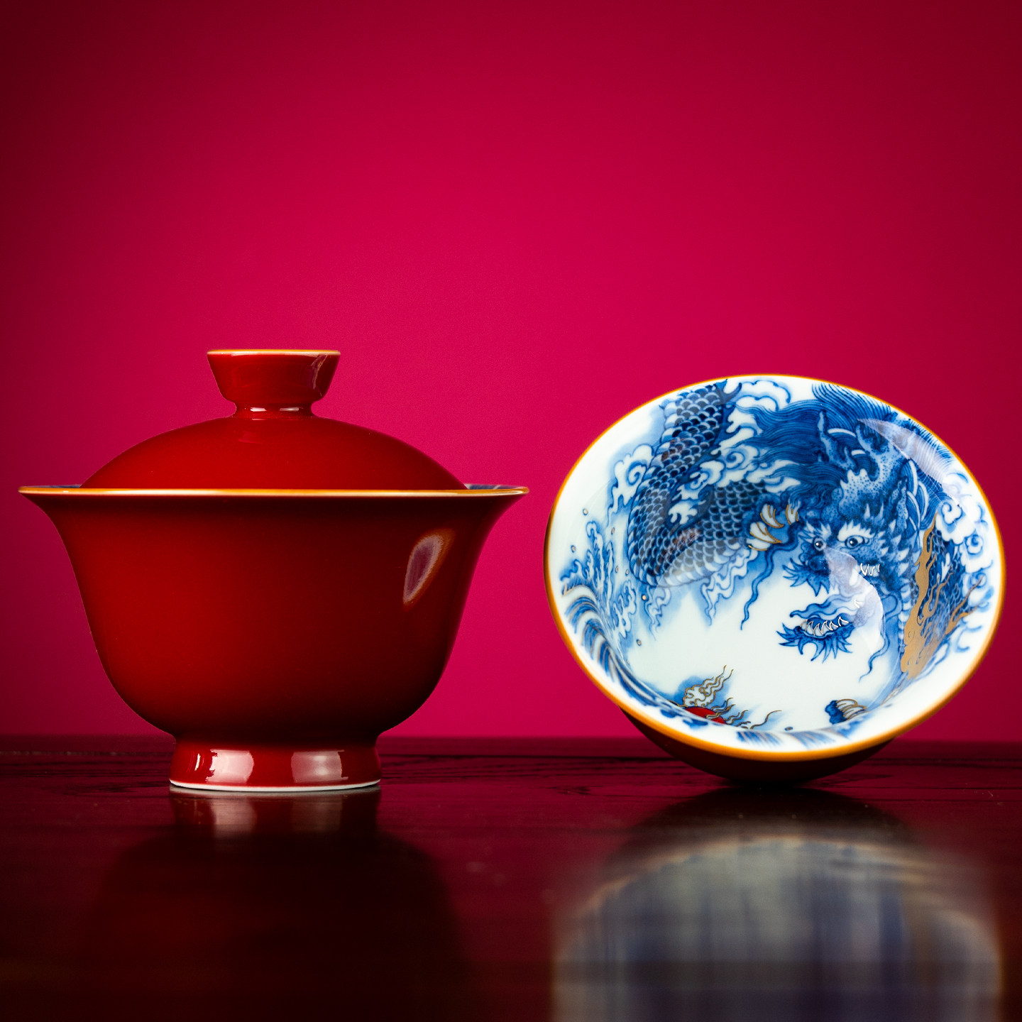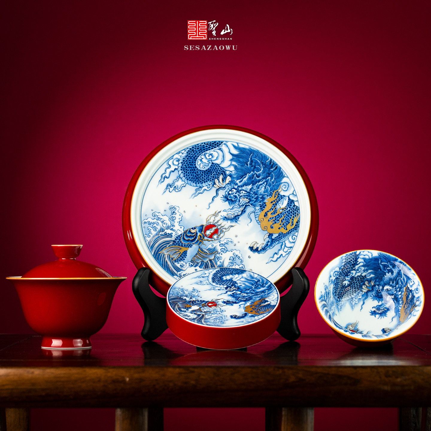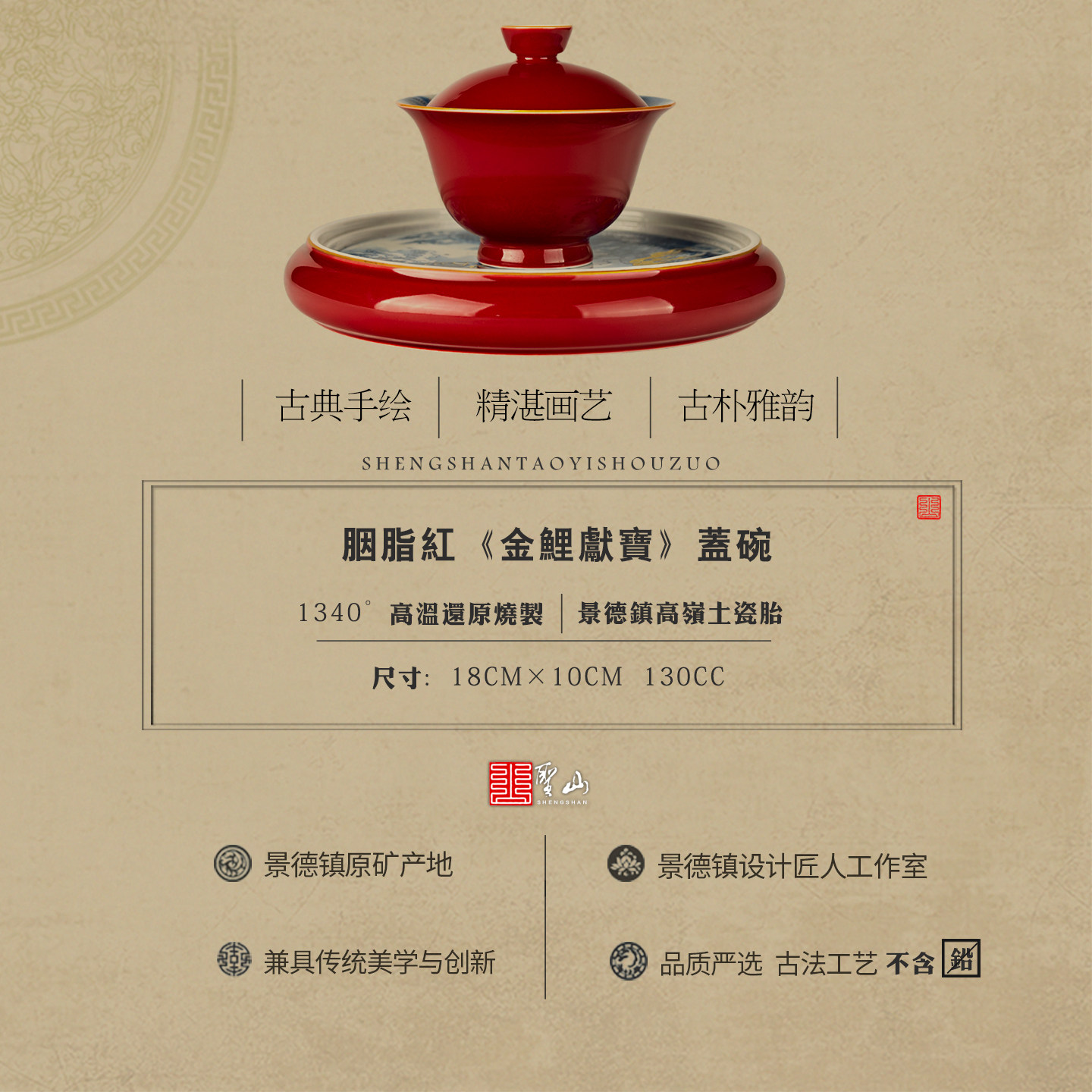 📚 圣山X旬真堂胭脂红金鲤献宝茶具景德镇手工陶瓷茶具盖碗泡茶盖碗