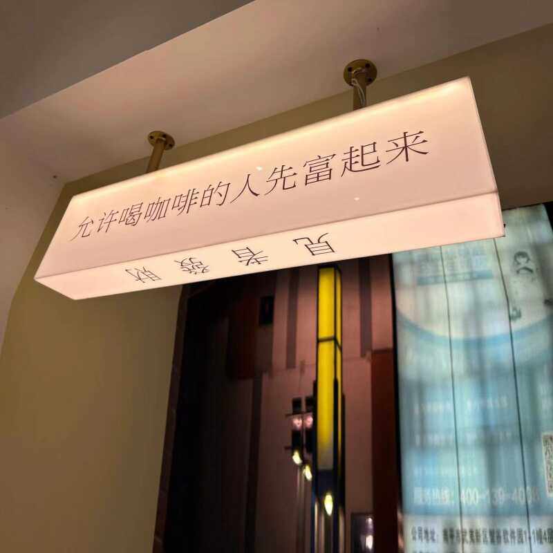 📚 允许喝咖啡的人先富起来双面吊挂吧台收银台亚克力发光灯箱定制