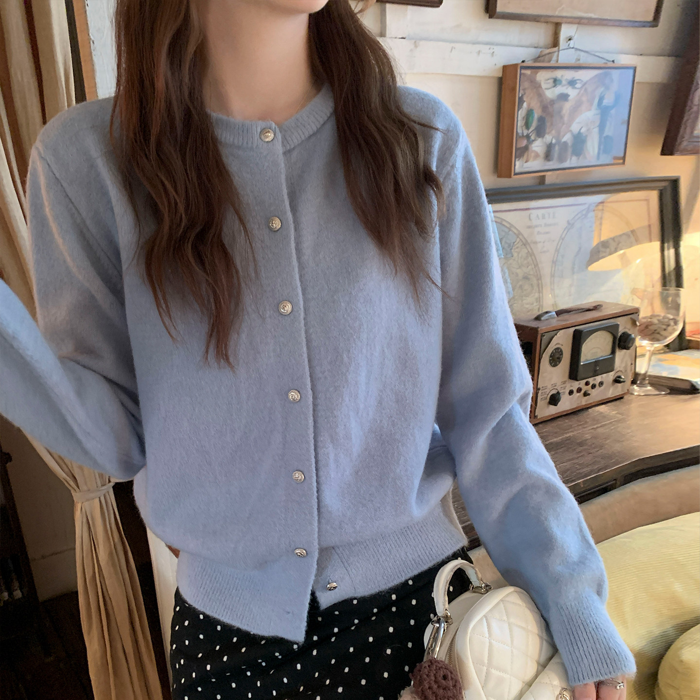 📚 龙妹家蓝色针织开衫外套毛衣女内搭2025早秋新款高级慵懒宽松上衣