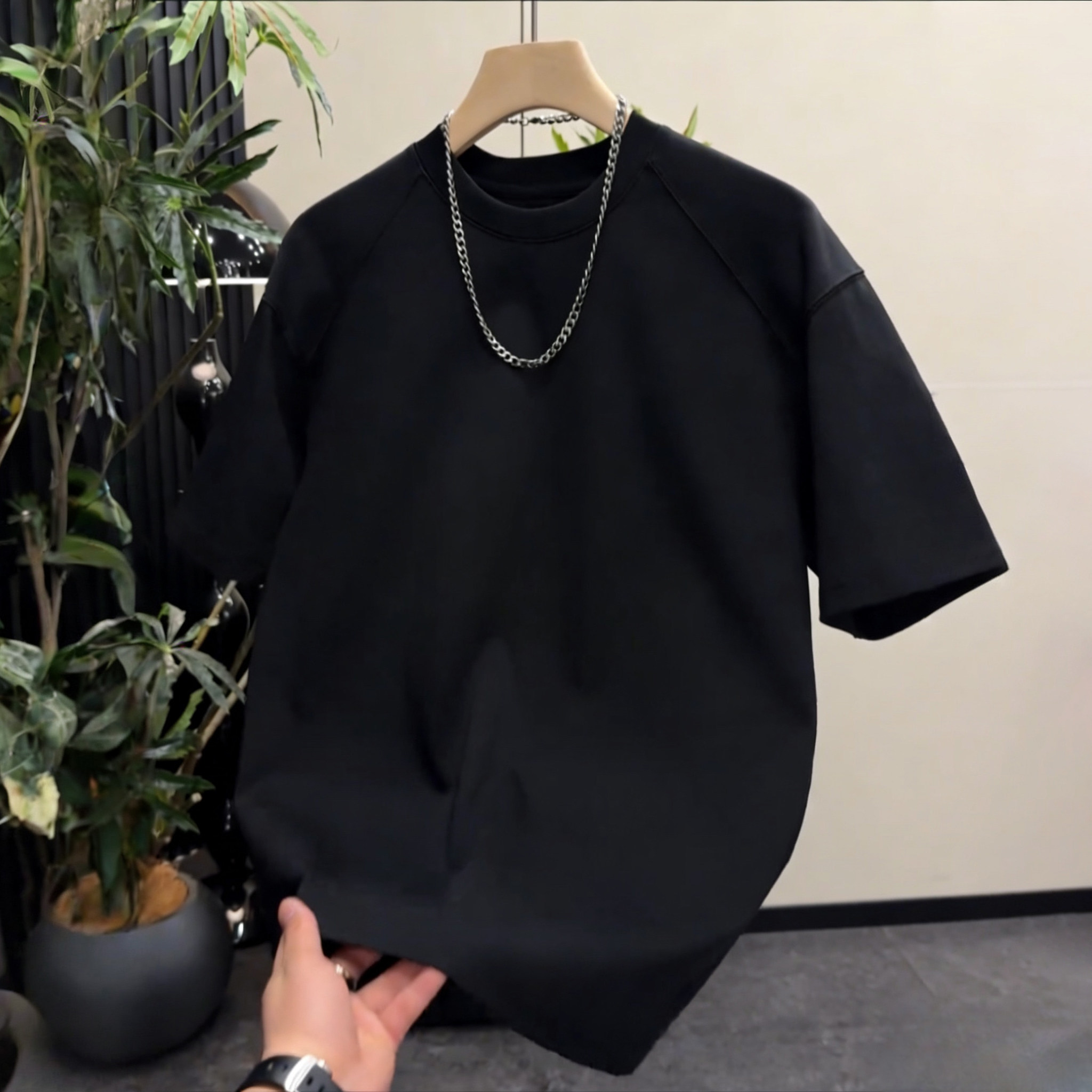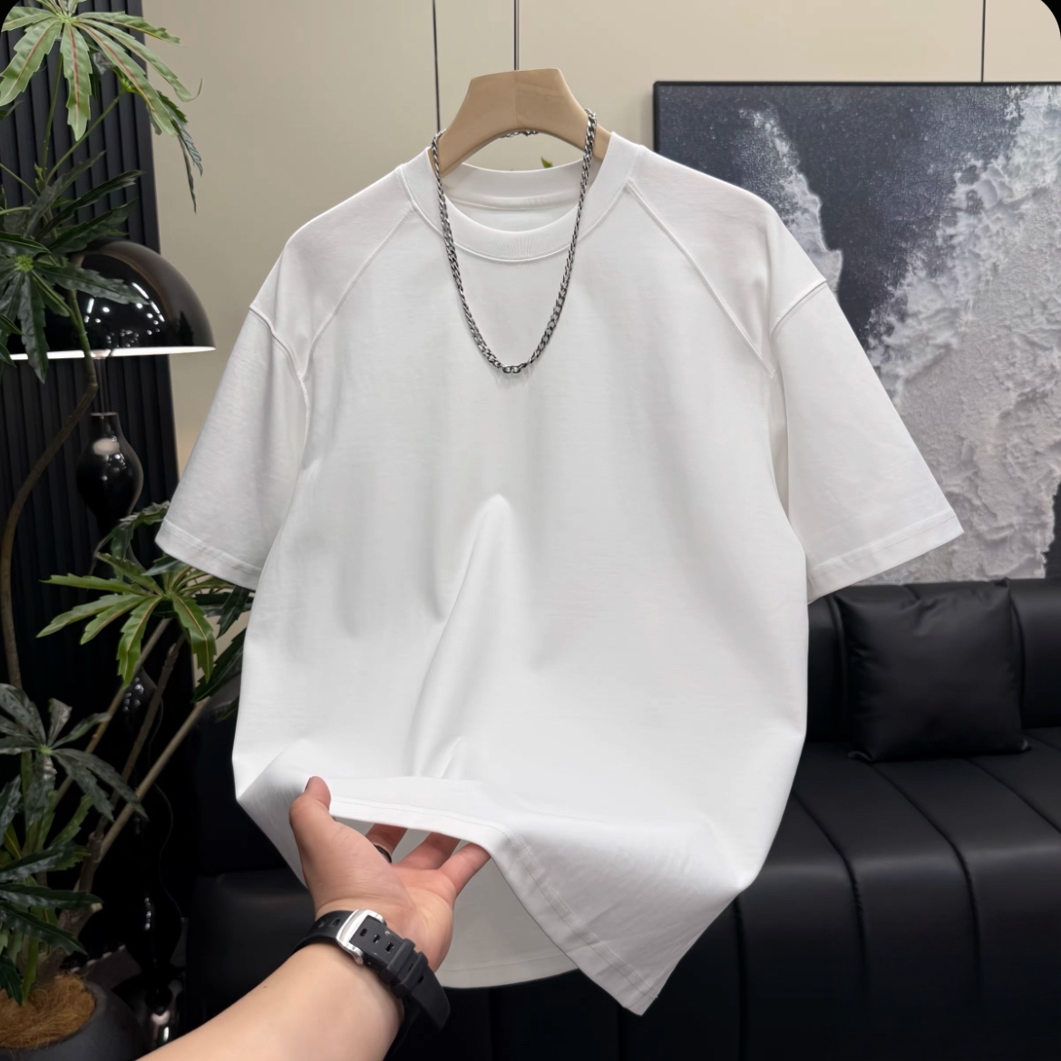 📚 夏季重磅纯色短袖T恤男潮牌宽松休闲圆领拼接设计感打底衫半袖潮