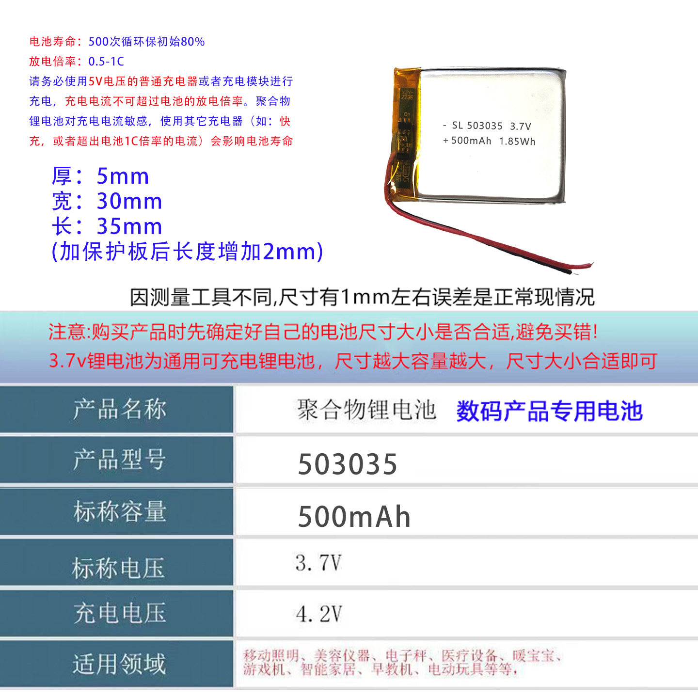 📚 503035点读笔行车记录仪3.7V聚合物电池小软包锂电池通用型可充电