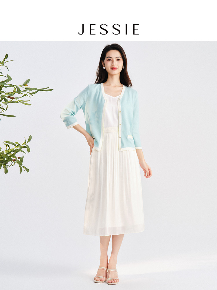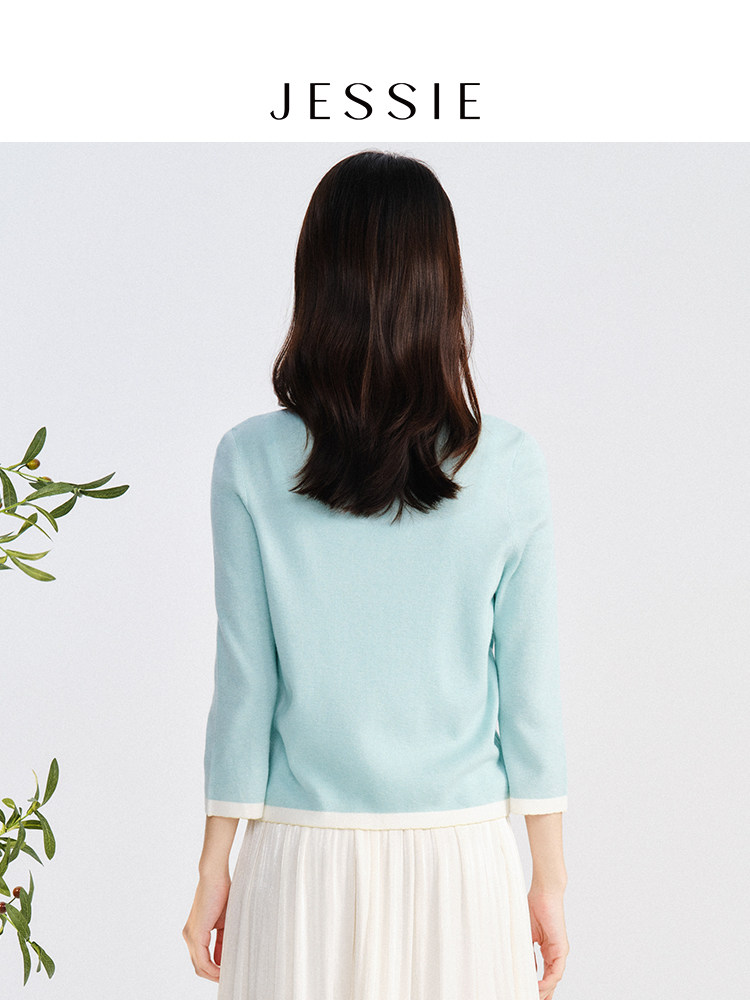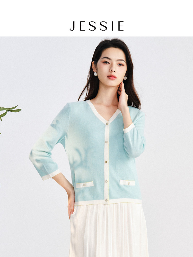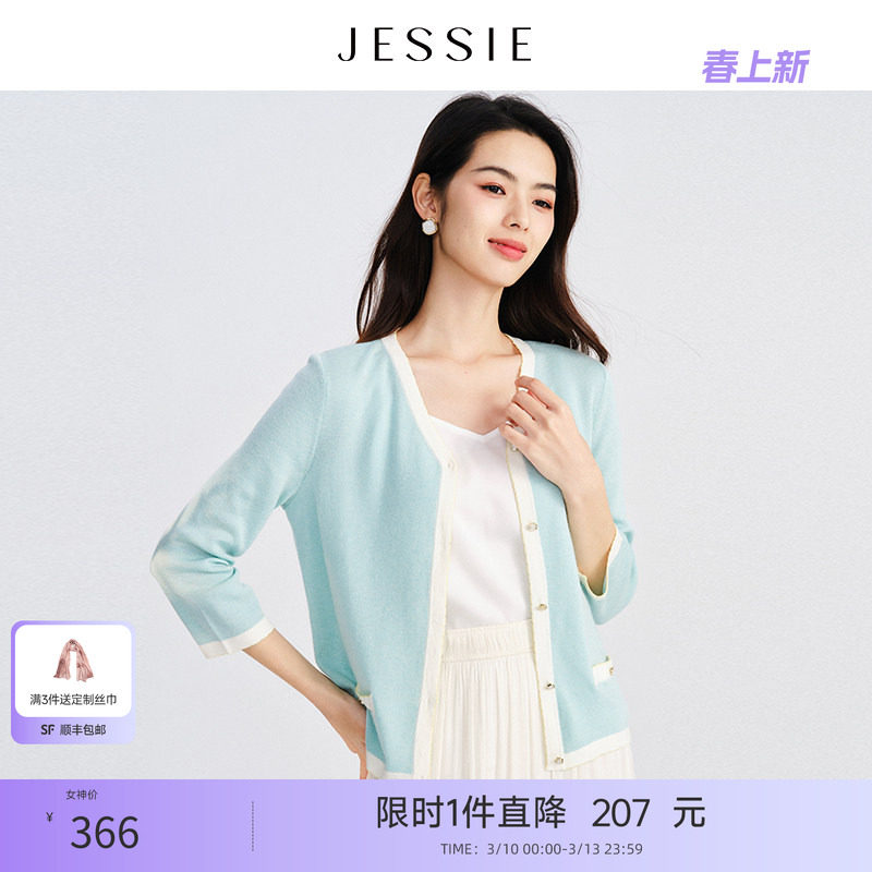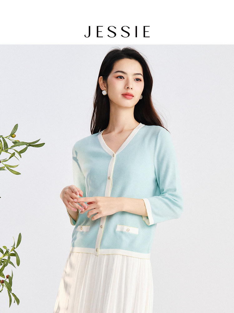 📚 JESSIE时尚减龄撞色V领羊毛针织开衫女春季新款纯色上衣外套