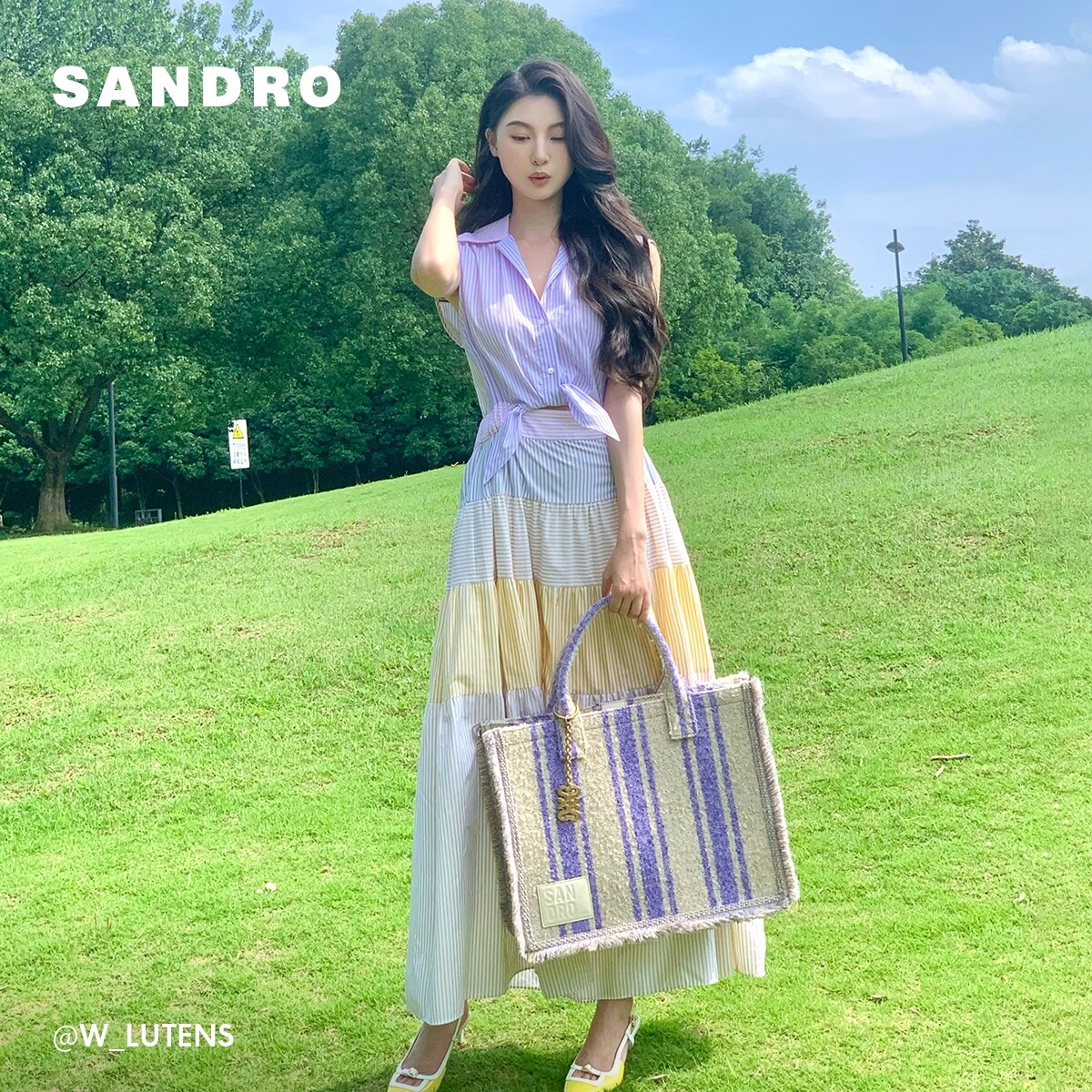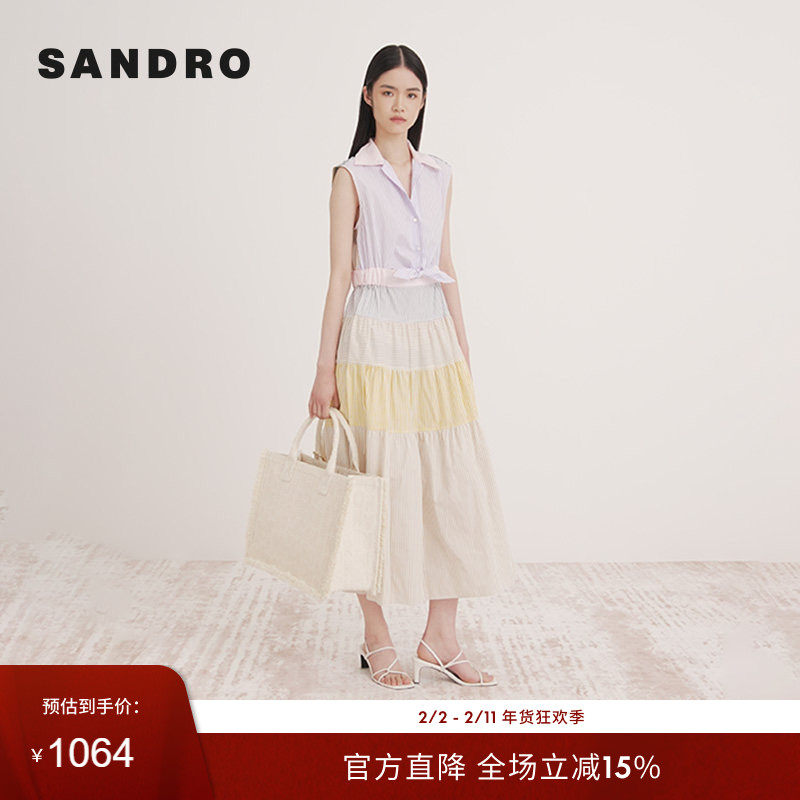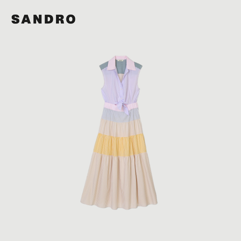 📚 SANDRO Outlets博主同款春夏女装法式优雅棉质条纹拼色长款连衣裙