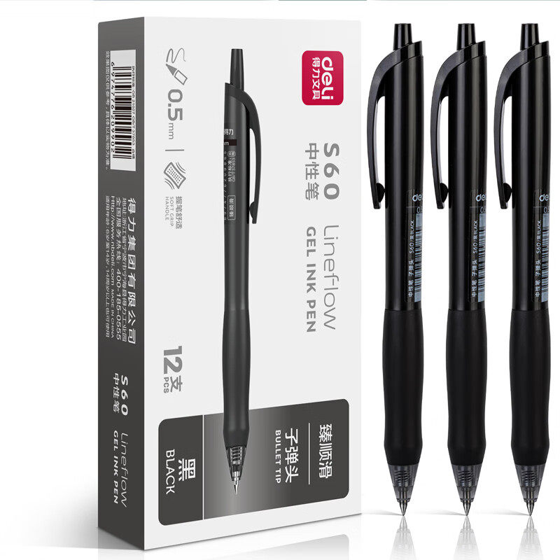 📚 得力S60臻顺滑办公中性笔0.5mm子弹头(黑/红/蓝/墨蓝)(笔芯6906H)