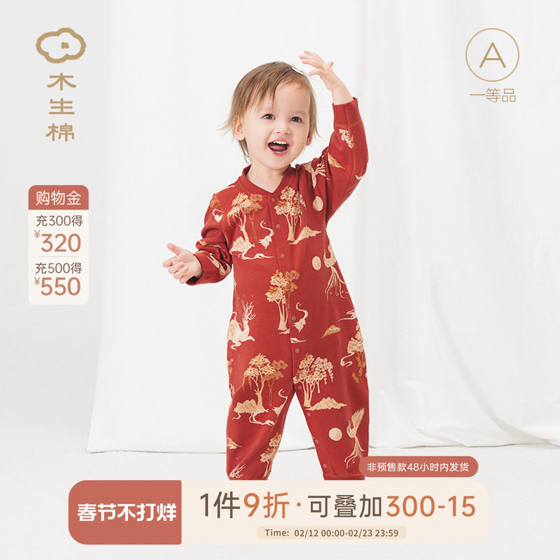 📚 木生棉宝宝纯棉连体衣哈衣春秋四季婴儿红色喜庆百天满月居家爬服