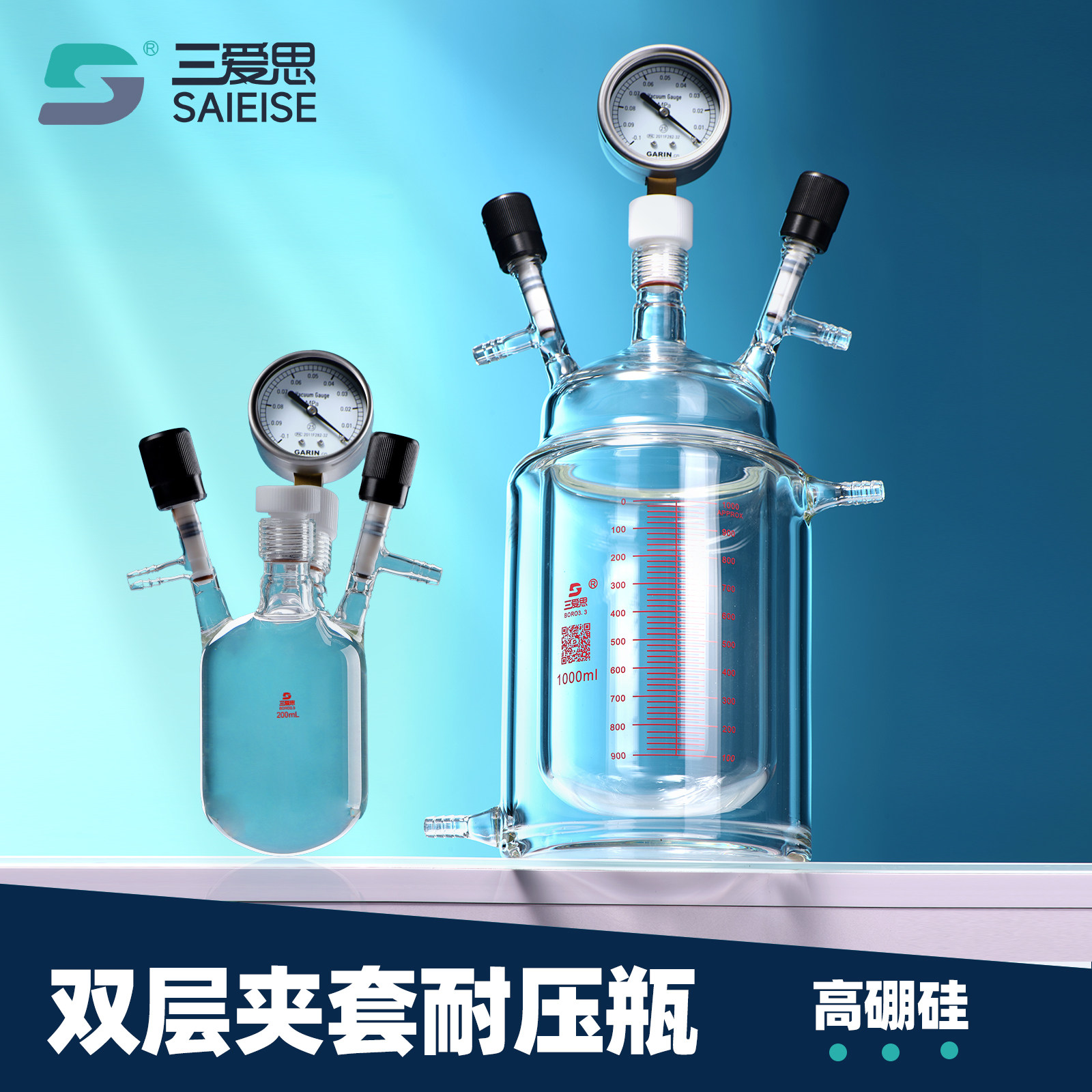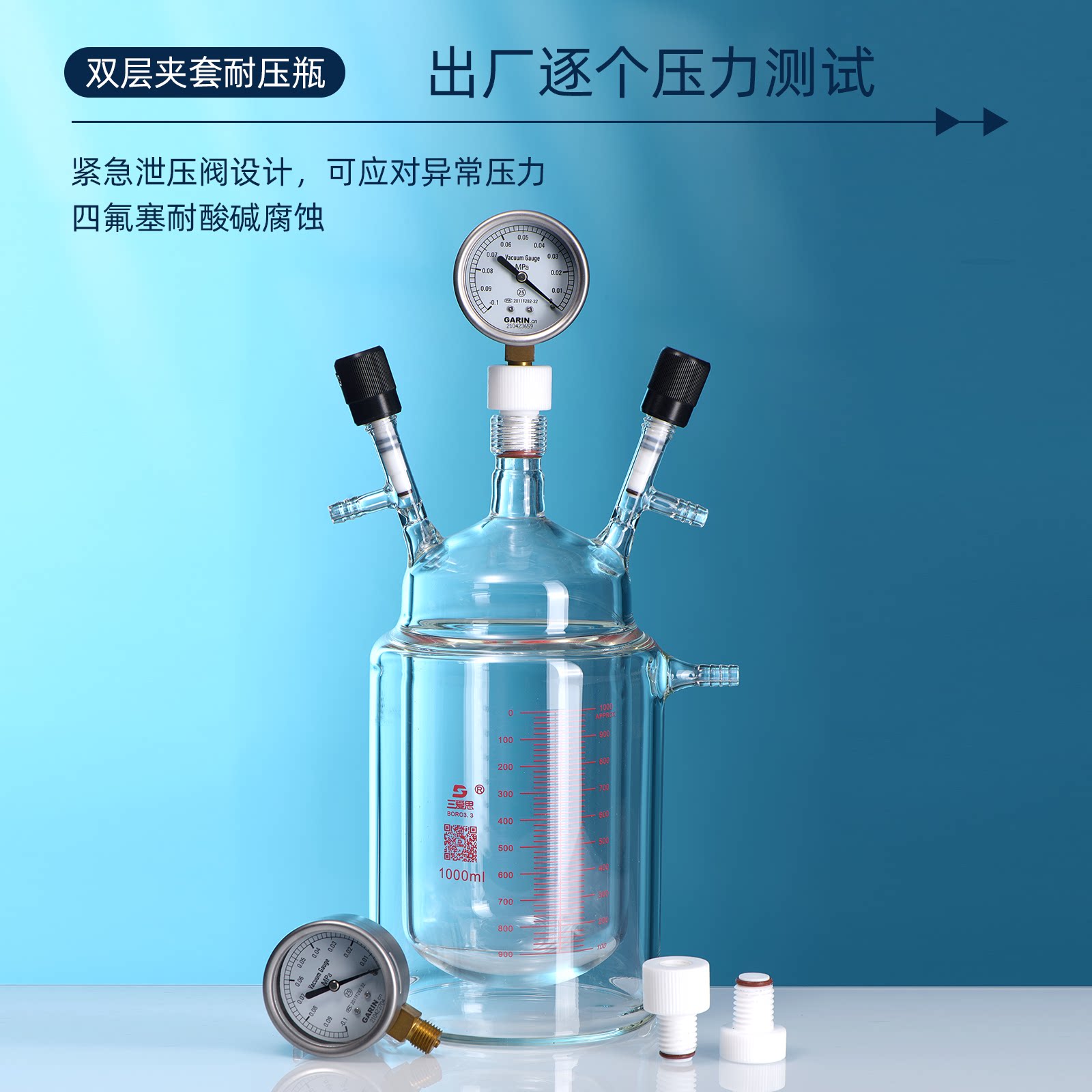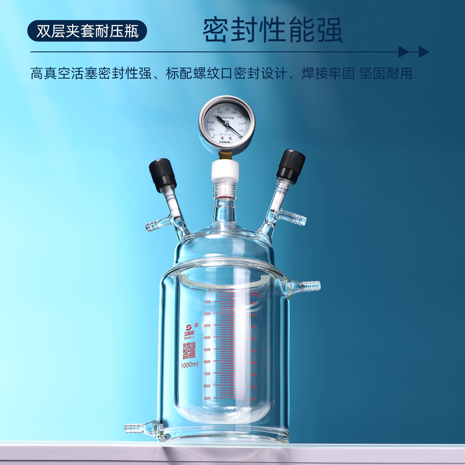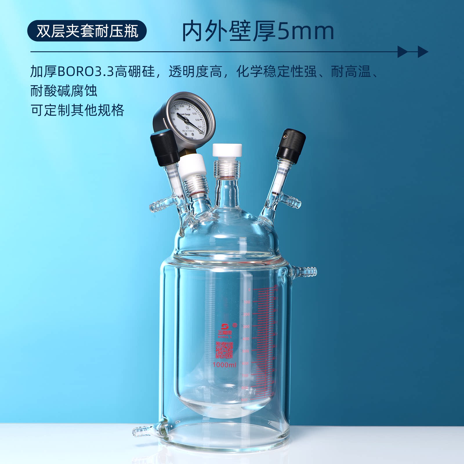 📚 三爱思 双层夹套耐压瓶F45 厚壁烧瓶200-2000ml 真空抽气带压力表 耐高温 高硼硅玻璃 物理化学实验室器材