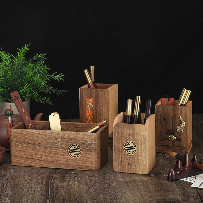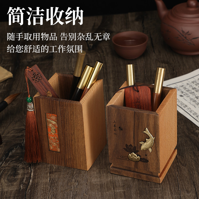 📚 桌面摆件笔筒收纳盒定制中式办公室书桌整理神器刻字印logo简约风格古风创意设计感书房木笔桶