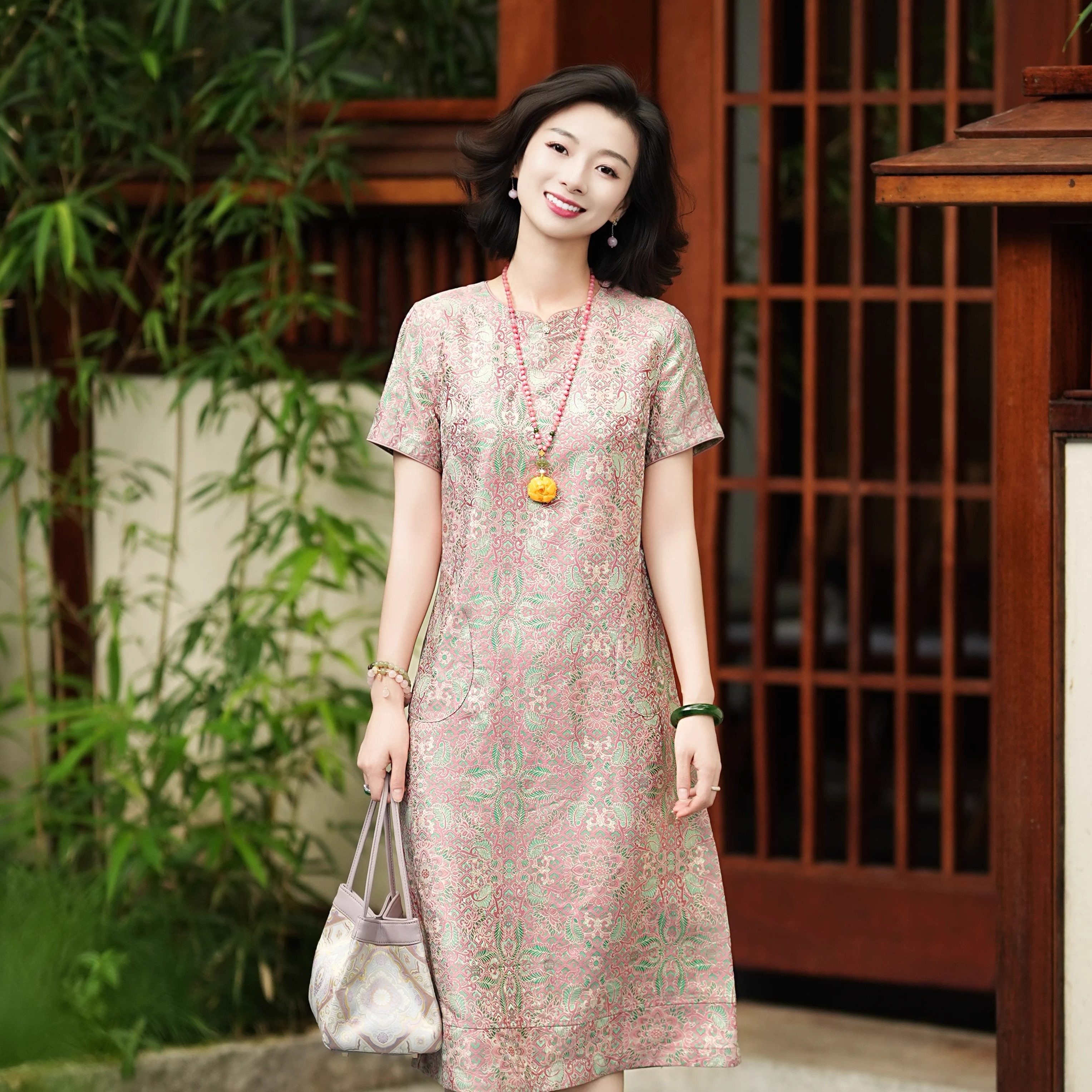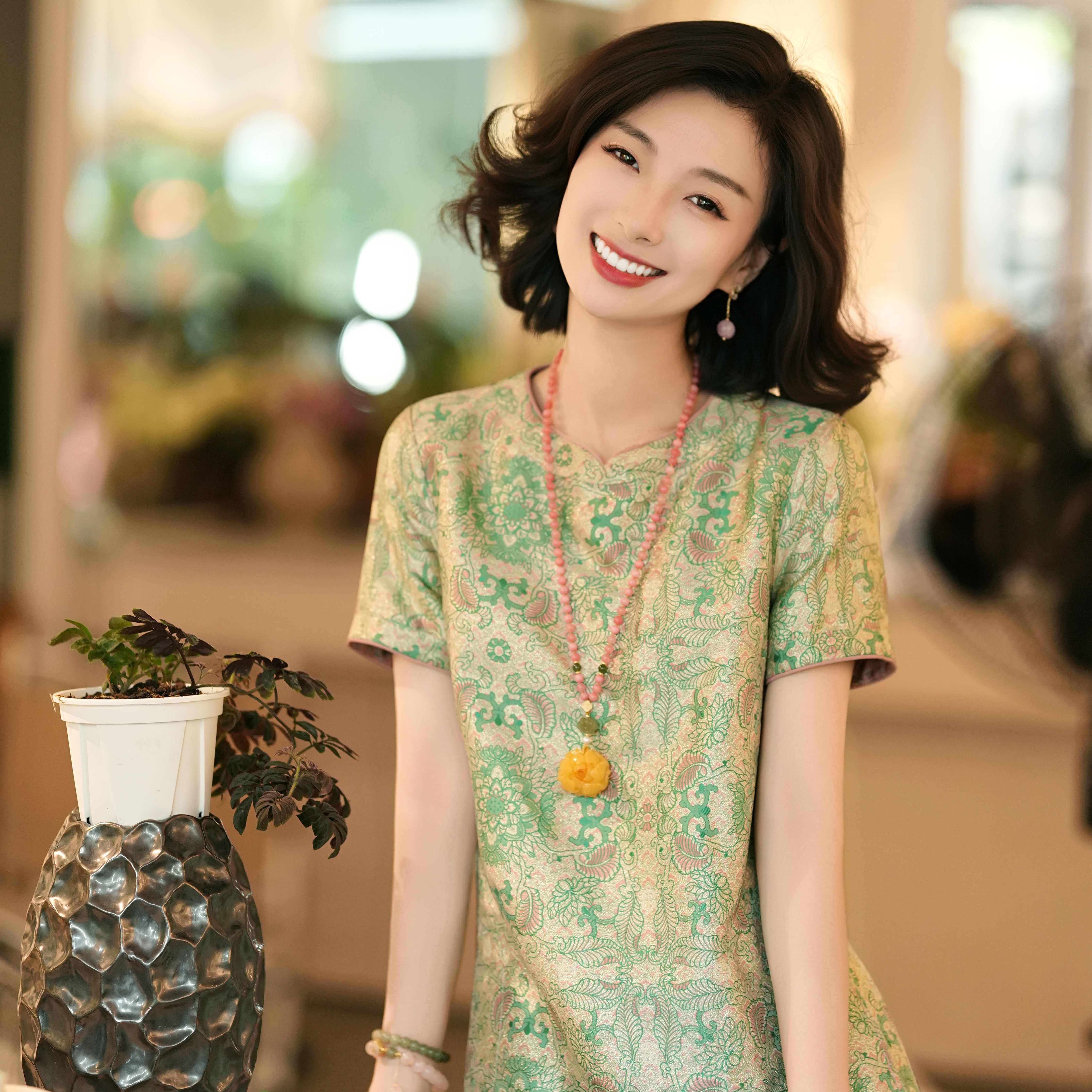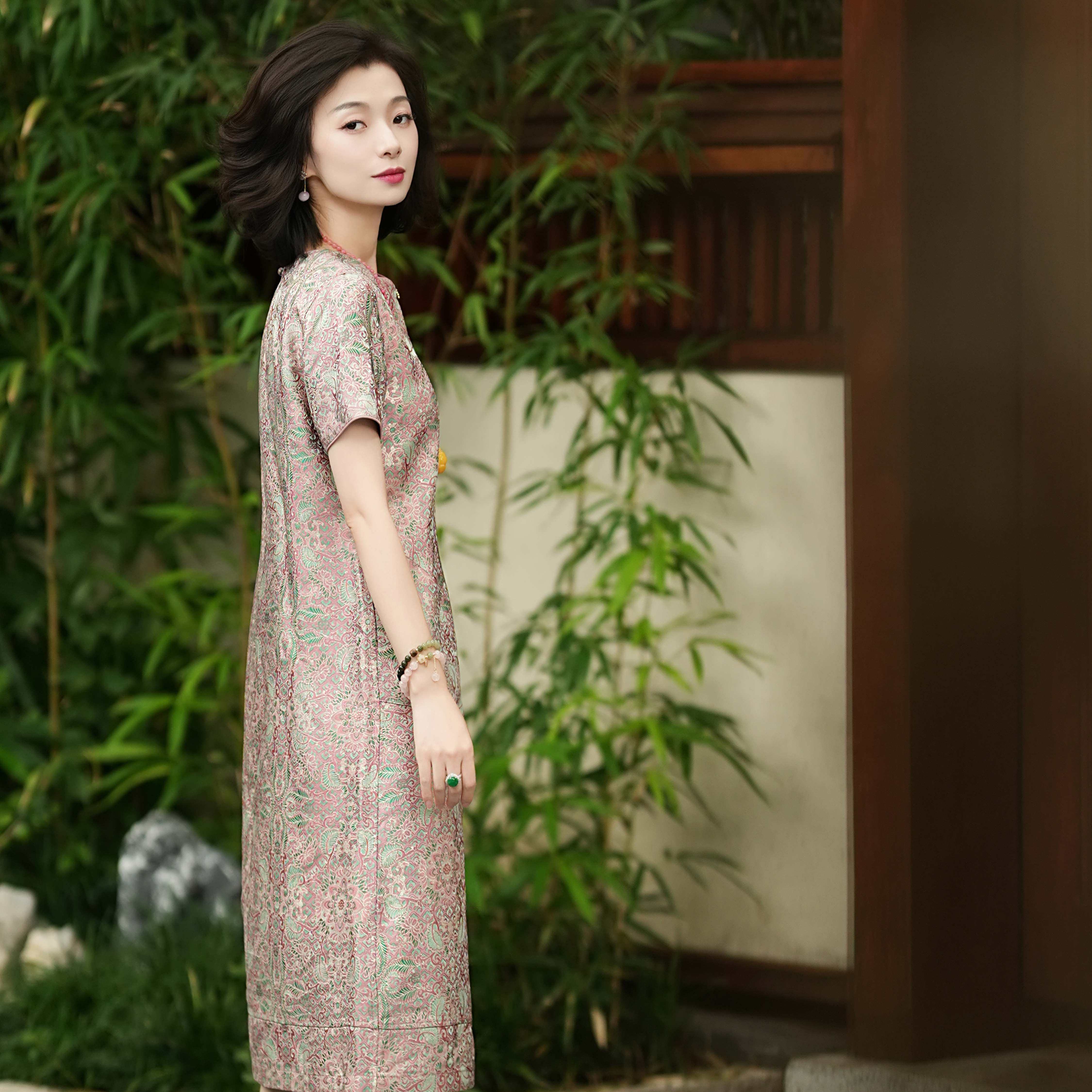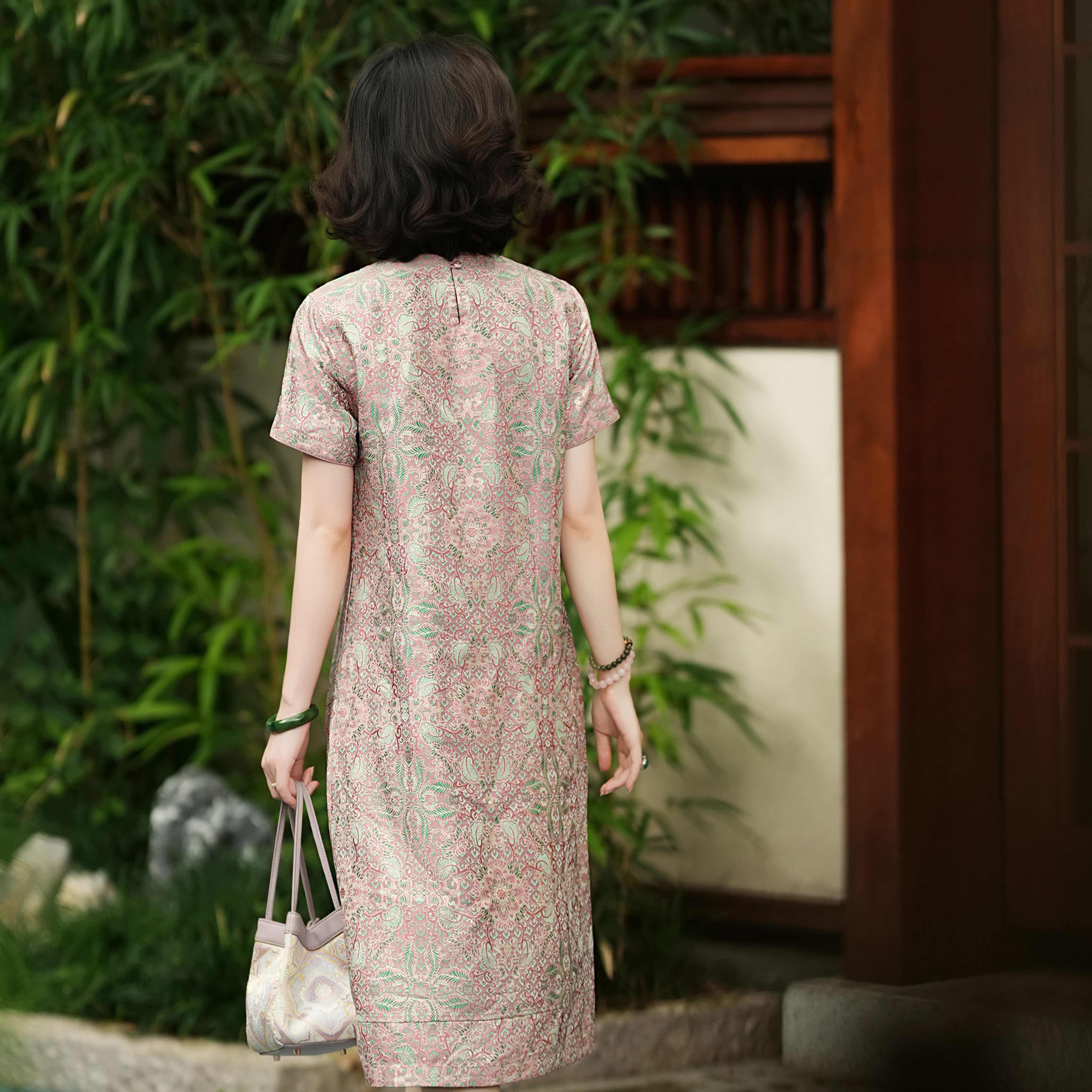 📚 西子/【定相逢】真丝宋锦旗袍桑蚕丝粉绿双面穿连衣裙夏/CQYF077
