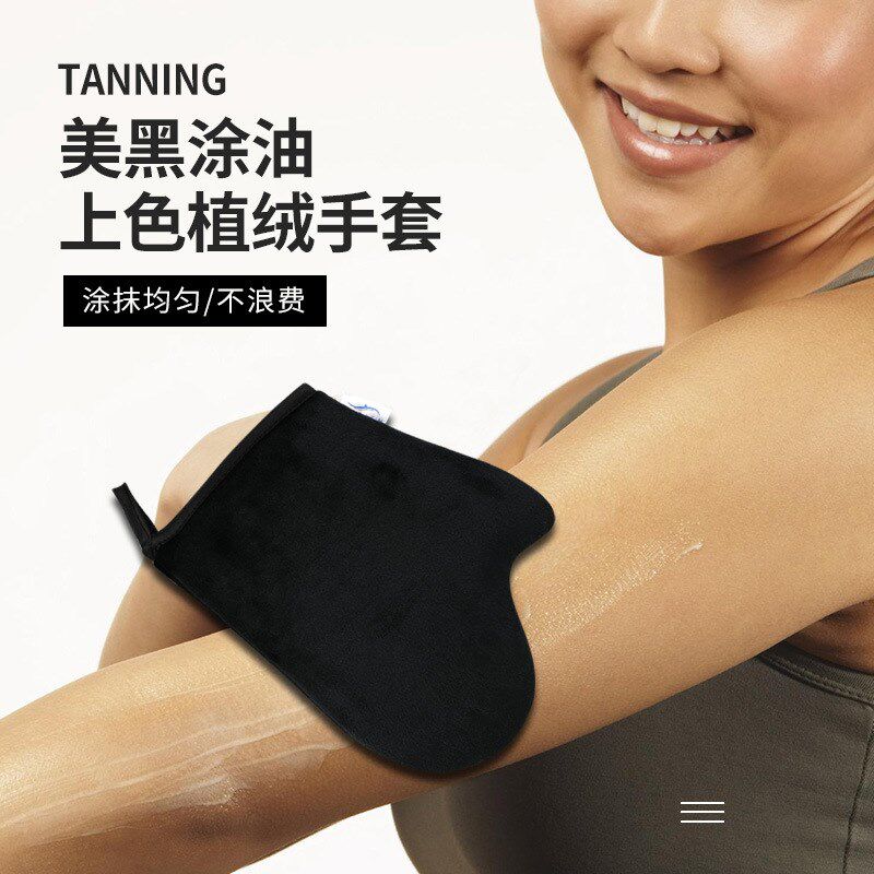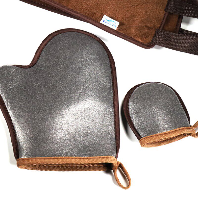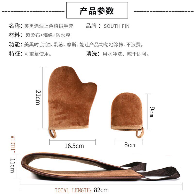 📚 棕色SOUTH FIN跨境去死皮搓澡巾美黑涂油上色植绒手套拉背条3件套