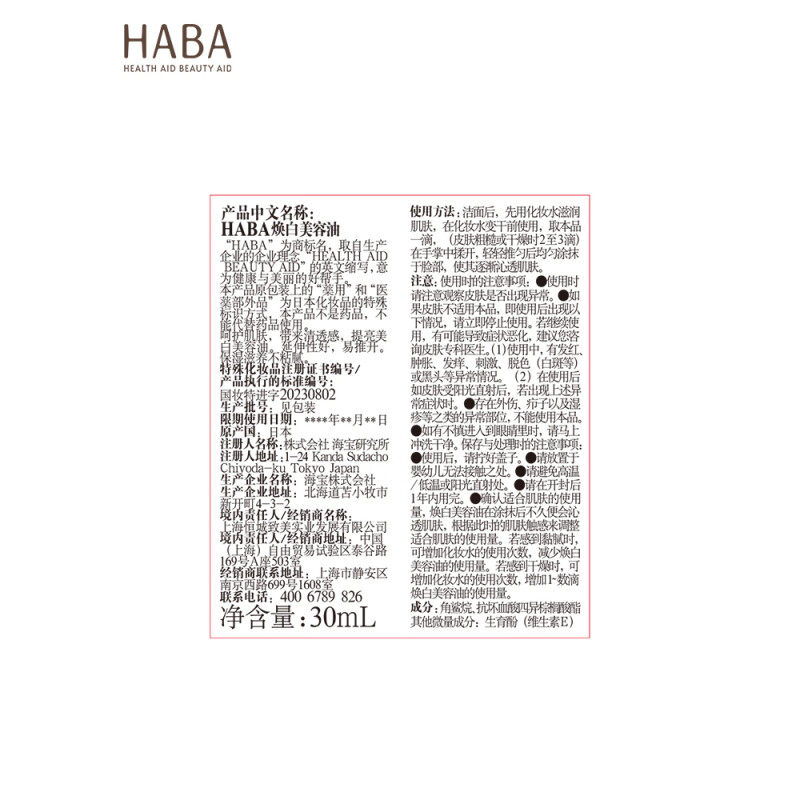 📚 日本进口HABA焕白美容油面部补水保湿滋养修护紧致美白护肤精华油