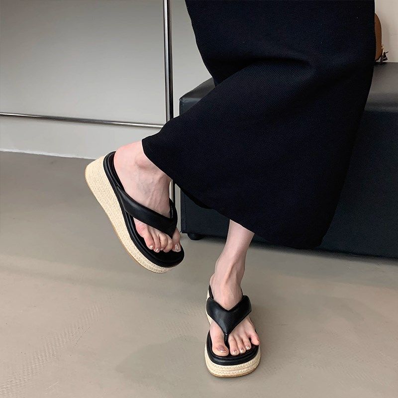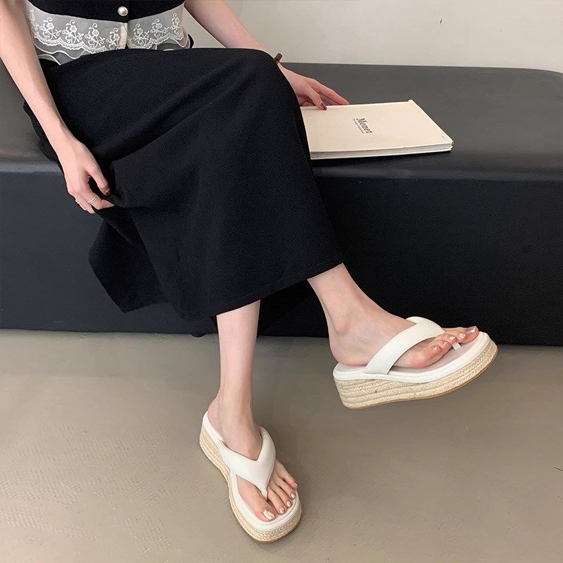 📚 厚底坡跟b夹脚凉拖鞋女时尚外穿2025夏季新款麻绳增高小个子人字