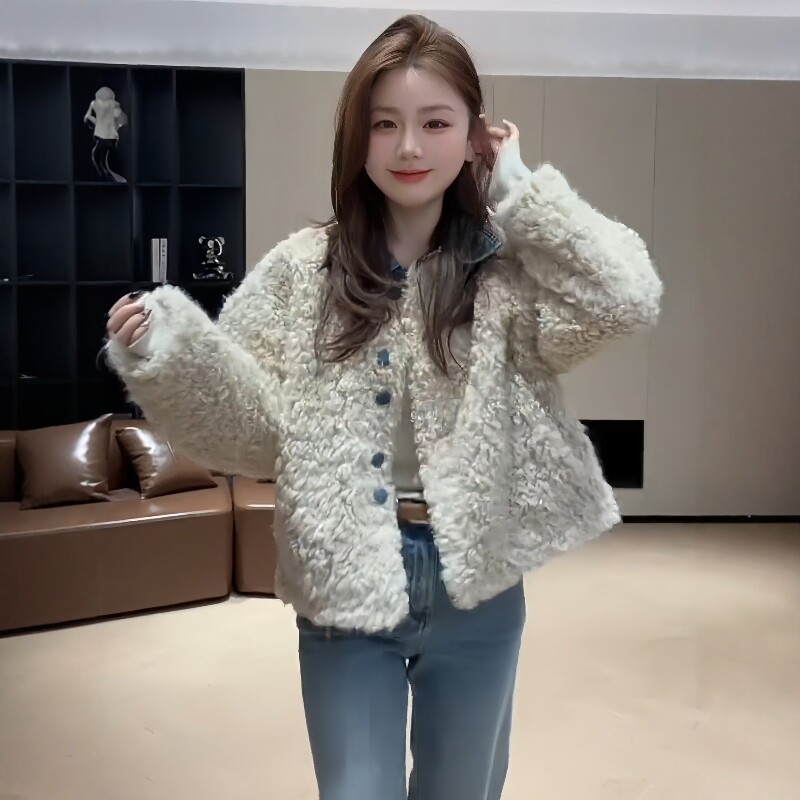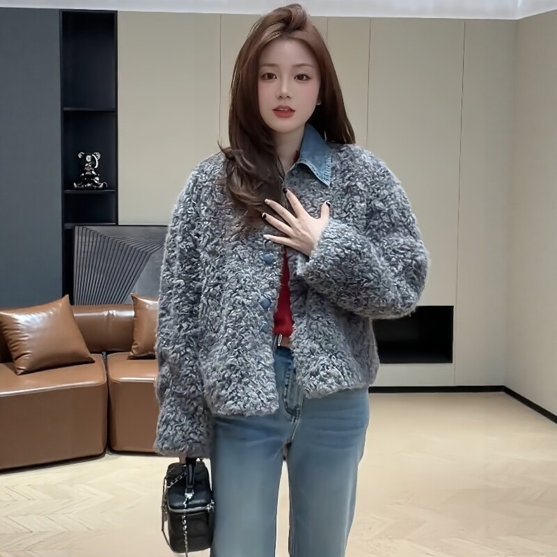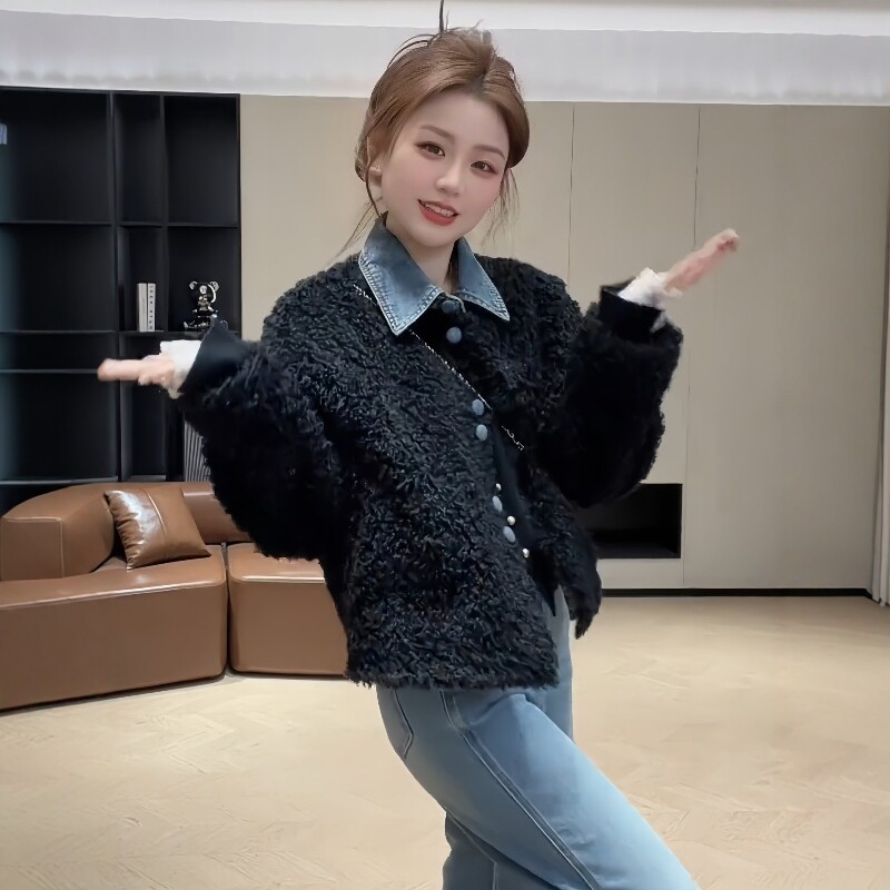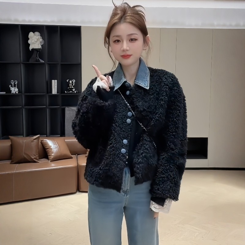 📚 复古牛仔领拼接羊羔毛短款外套女秋冬新款洋气皮毛一体保暖上衣