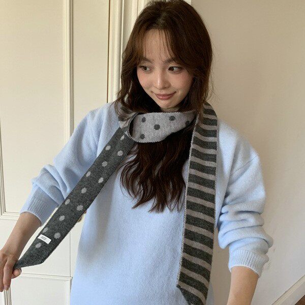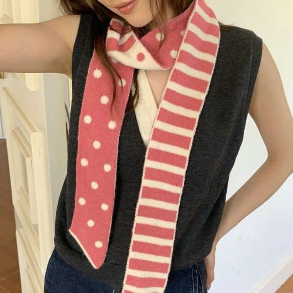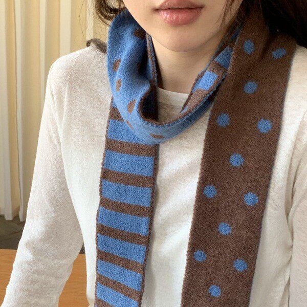 📚 小众搭配波点条纹拼色针织长条围巾秋冬复古新款细窄围脖韩国ins