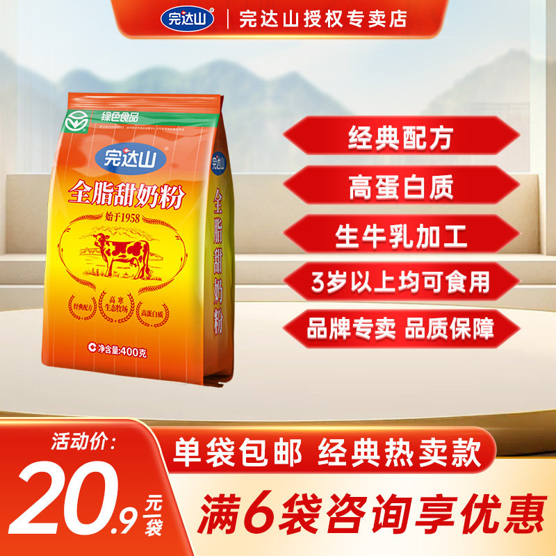 📚 6袋领券 完达山全脂甜奶粉400g 青少年学生中老年成人早餐酒店