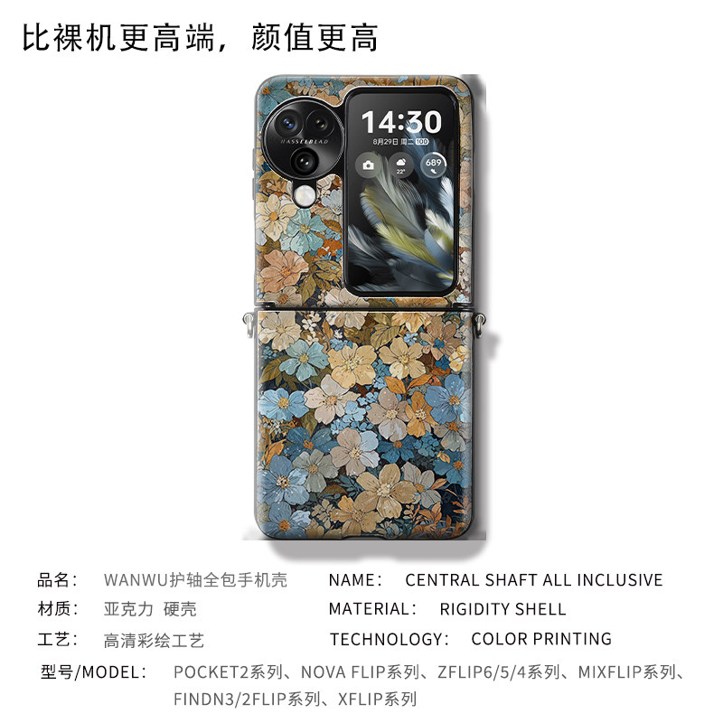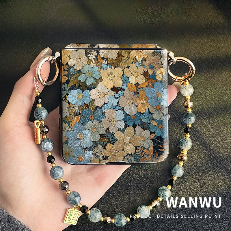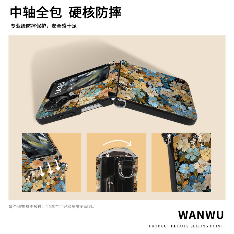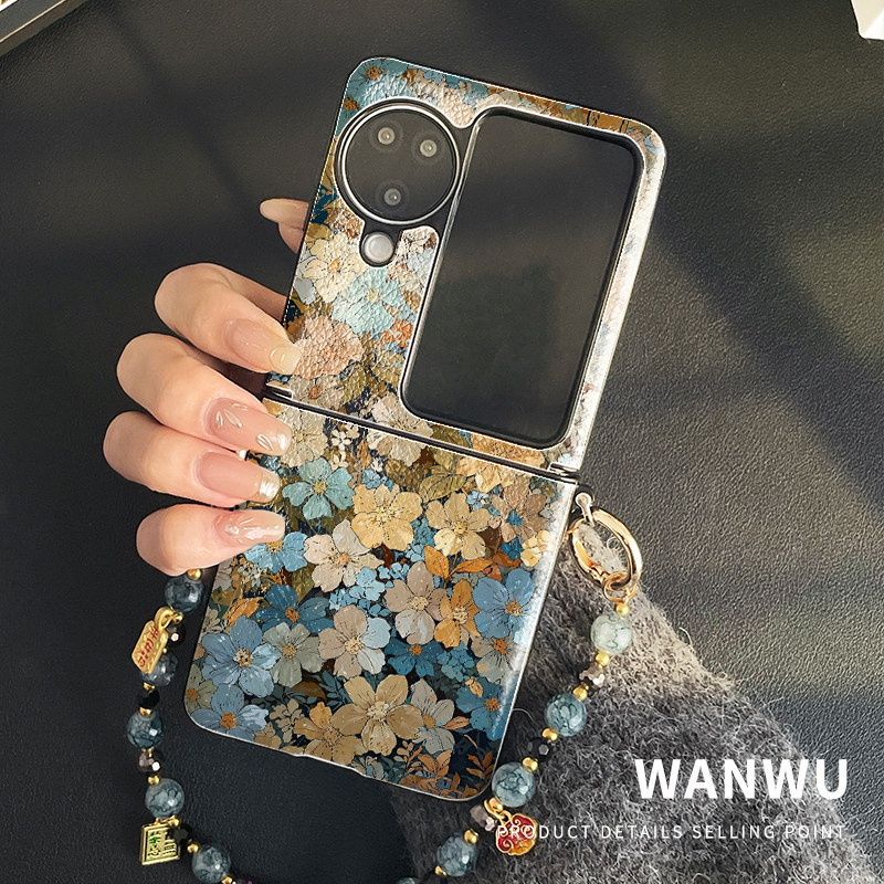 📚 卡通韩系手绘花朵适用小米mixflip手机壳带挂绳p50pocket新款皮纹findn3flip外壳zflip5全包防摔nova中轴保护