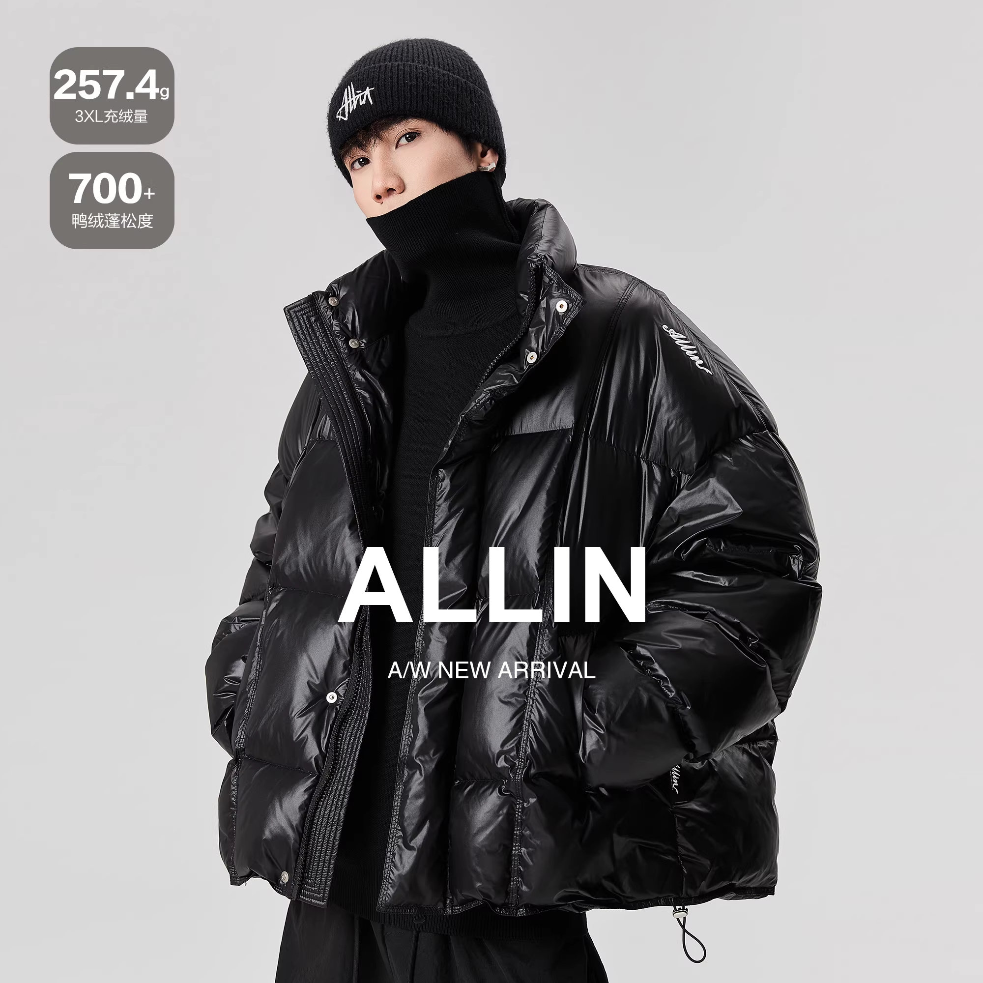 📚 ALLIN 黑色鸭绒羽绒服男冬季加厚保暖面包服字母刺绣立领短款外套