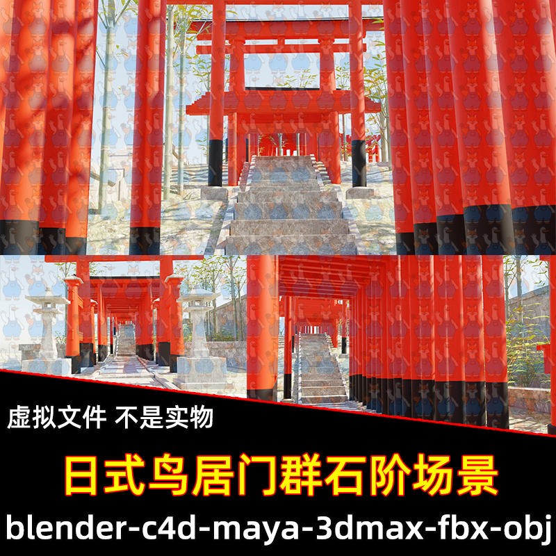 📚 Blender日式神社鸟居门群石阶牌坊门头树木3D模型FBX素材c4d maya