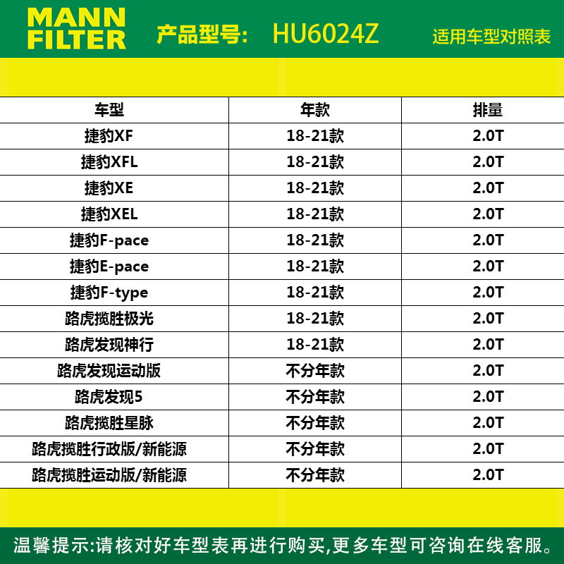 📚 曼牌机油滤芯HU6024/1Z适用捷豹XF XFL XE XEL FPACE EPACE 2.0T