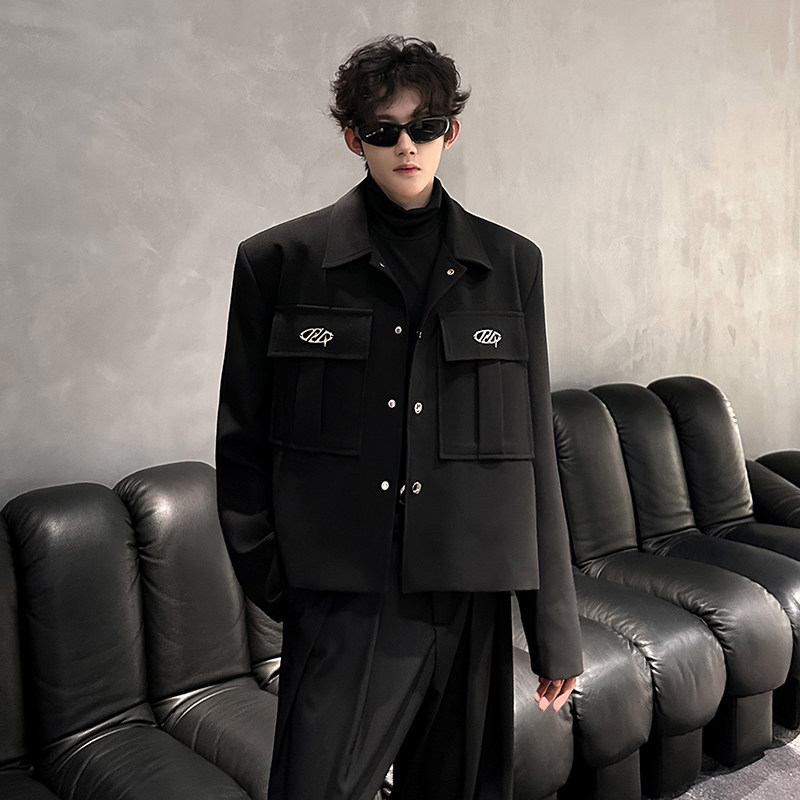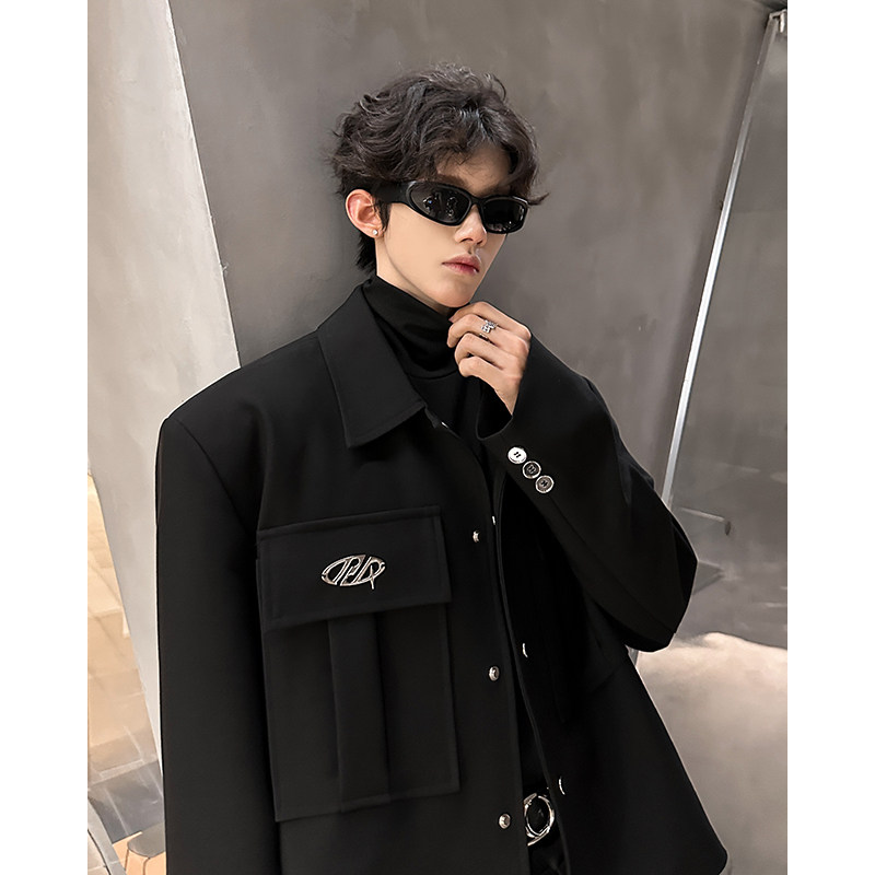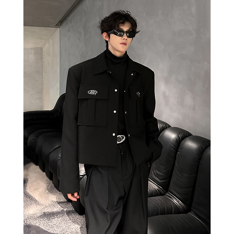 📚 小众金属装饰工装垫肩短款呢子夹克外套男模穿搭高级感痞帅西装潮