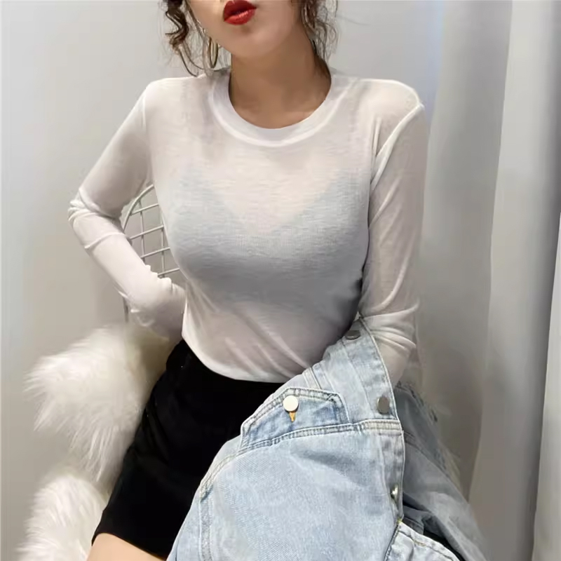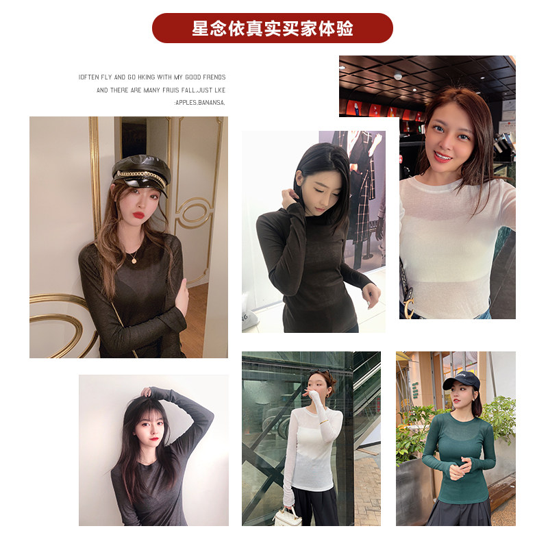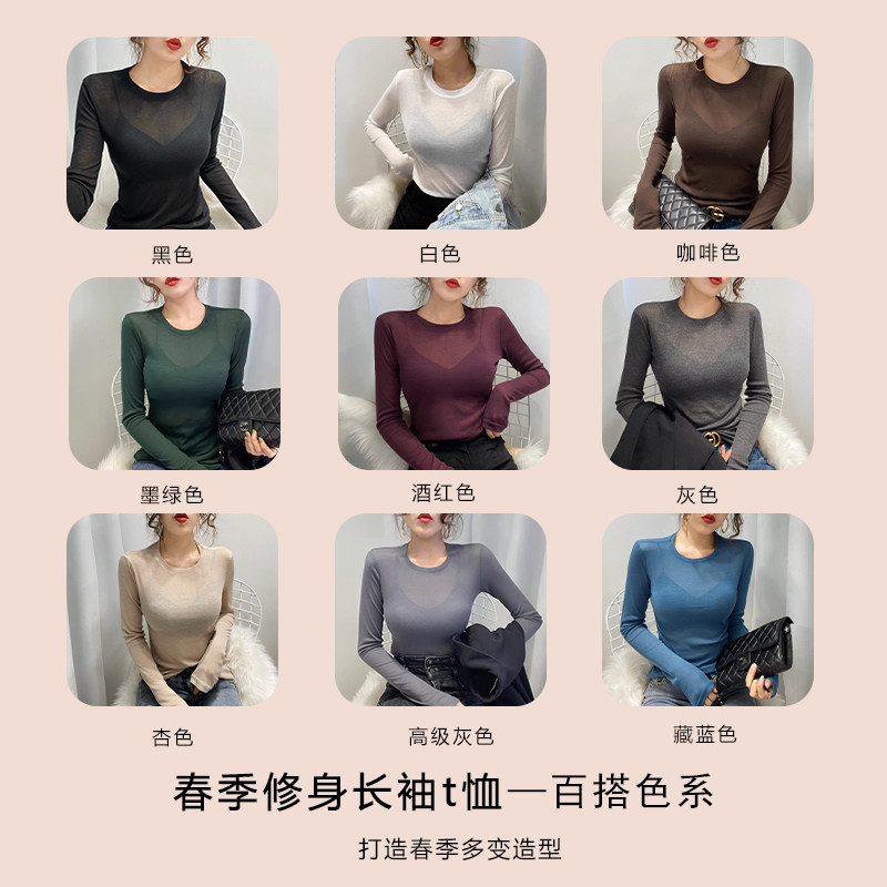 📚 咖色圆领打底衫女2025新款网纱内搭长袖薄纱透视t恤薄上衣高级感