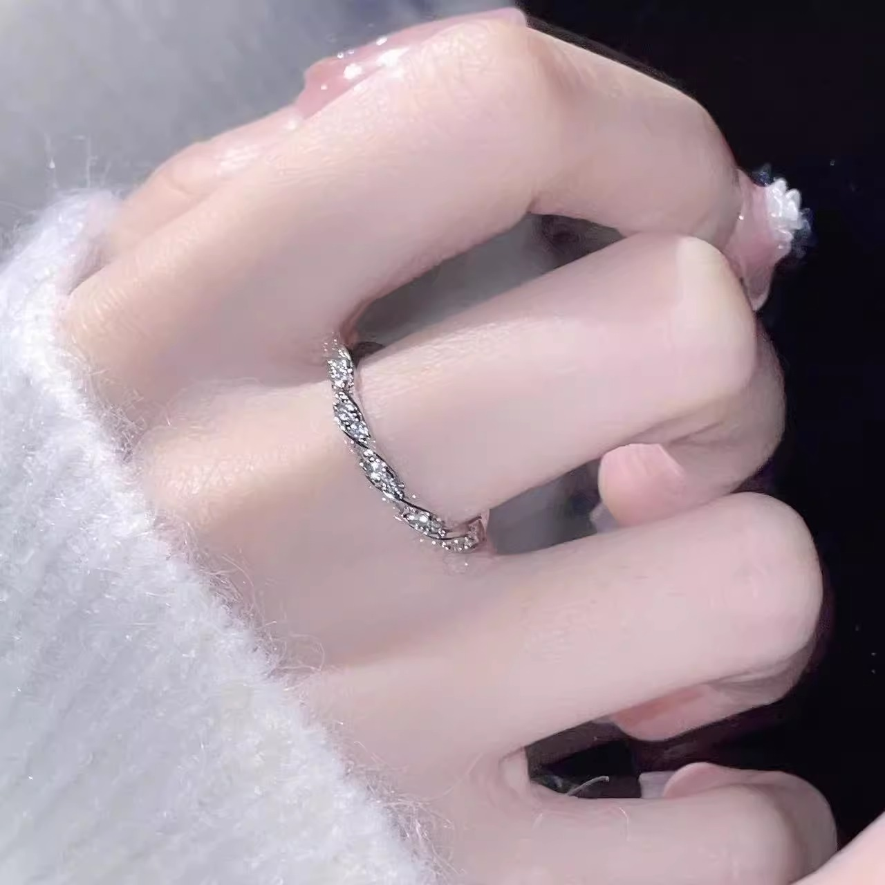 📚 925银缠绕爱河碎钻戒指女小众级轻奢ins风爆闪素戒麻花开口饰品