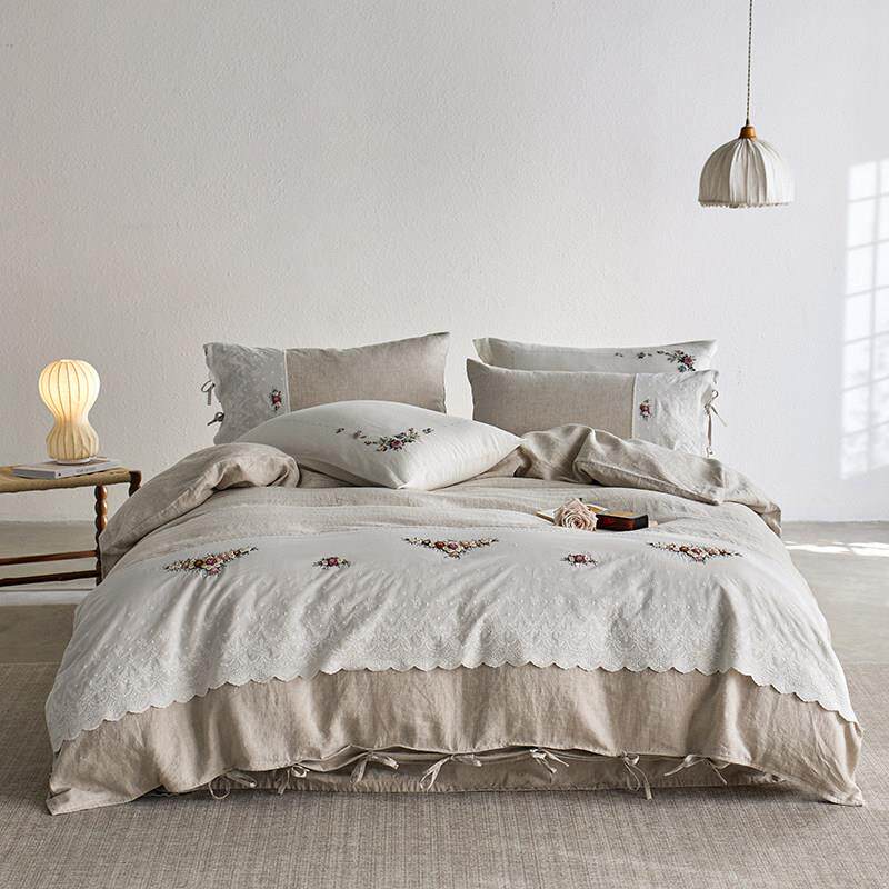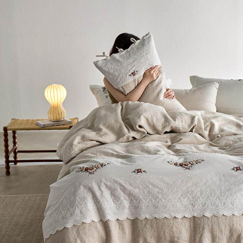 📚 法式蕾丝重磅汉麻四件套纯麻手工绣花被套雨露麻本色亚麻床上用品
