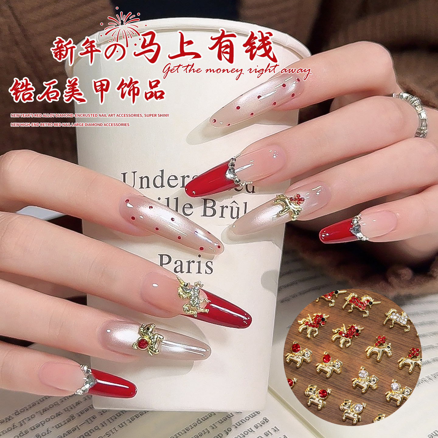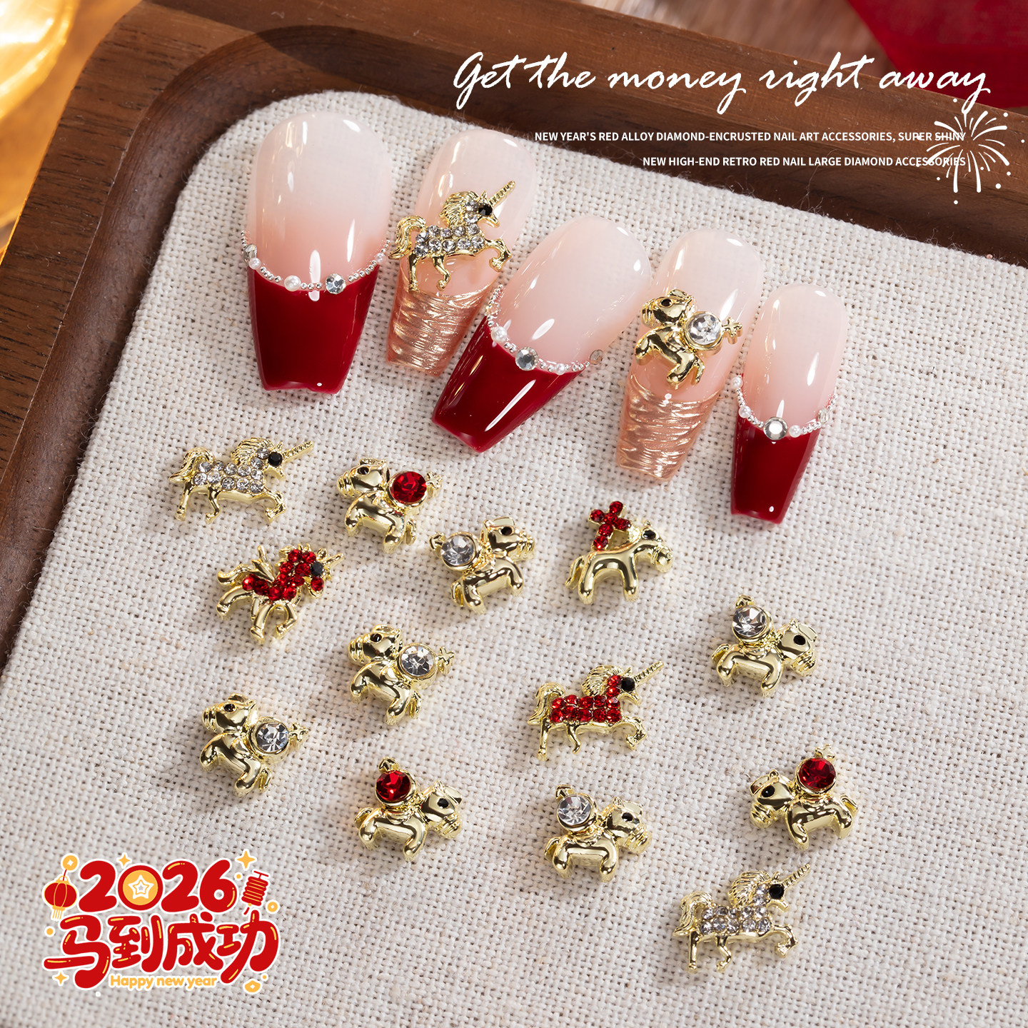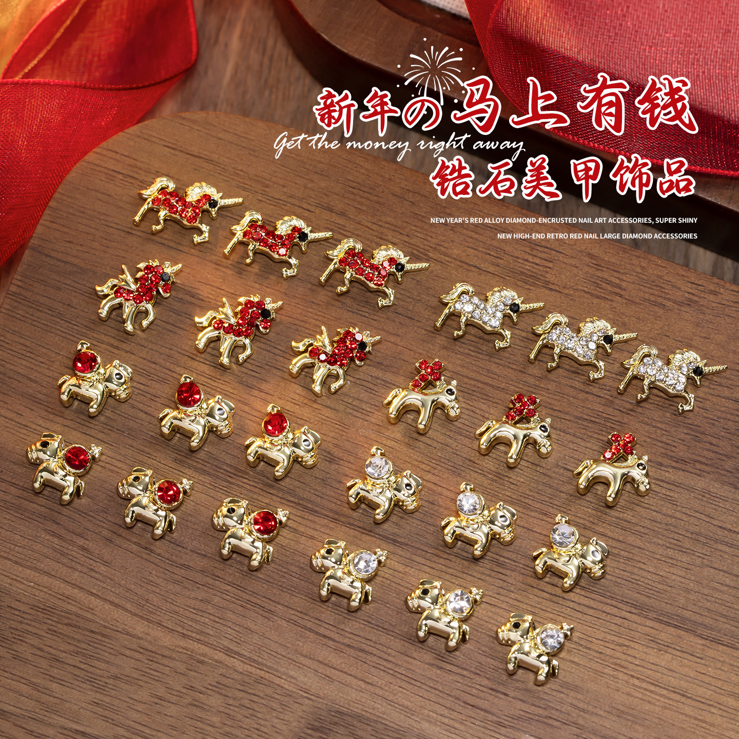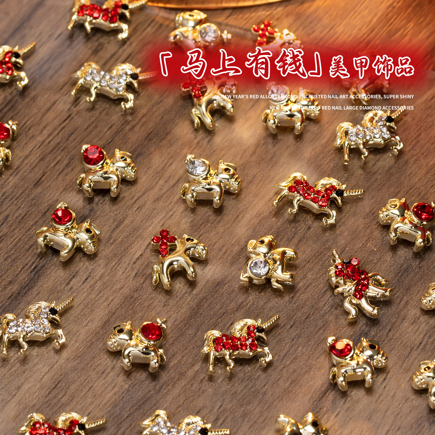 📚 2026马年美甲饰品马上有钱合金轻奢生肖小马爆闪锆石钻指甲装饰品